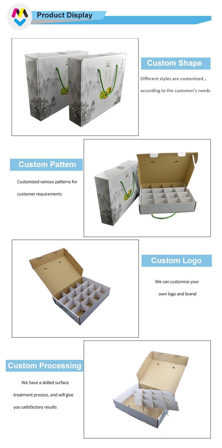 C'est un boîtes d'expédition pliables fabriqué par BE flute+ 250 g de CCNB ,c'est une sorte d'emballage de fruits avec un séparateur en carton dur, à l'extérieur de couleur blanche avec un motif personnalisé et à l'intérieur de la boîte de couleur kraft naturelle.