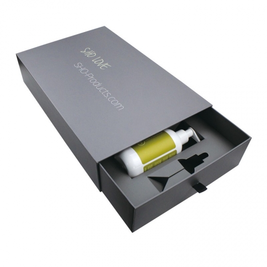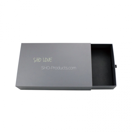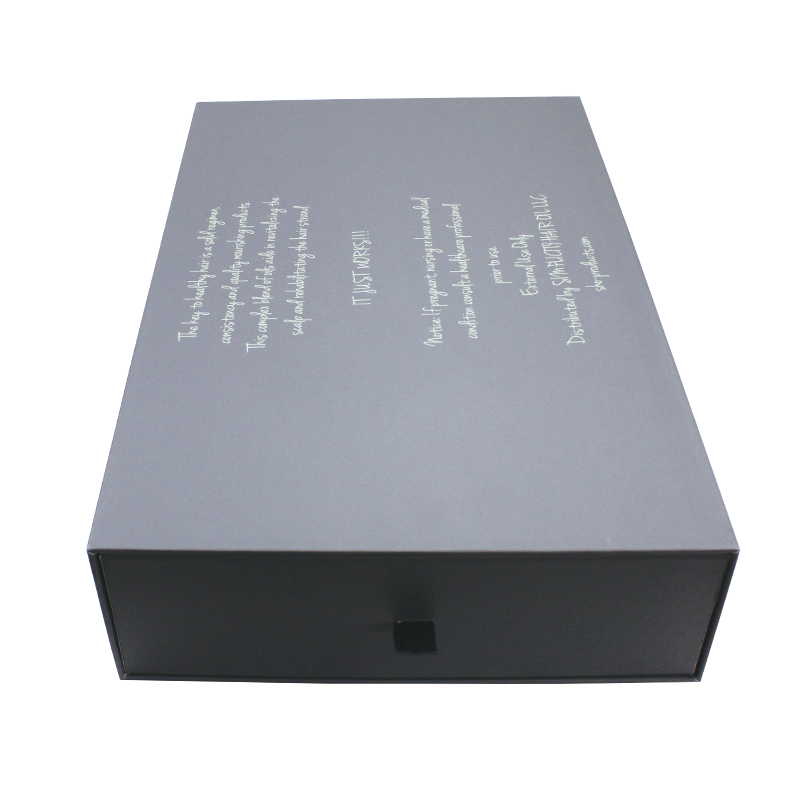 C'est une couleur gris mat boîte à tiroirs coulissants pour soins de beauté qui a fait par papier d'art C2S 157g + carton gris 1200g ,plein d'impression grise sur la boîte avec logo et texte sur mesure, la finition de surface mate lui donne un aspect haut de gamme et élégant.