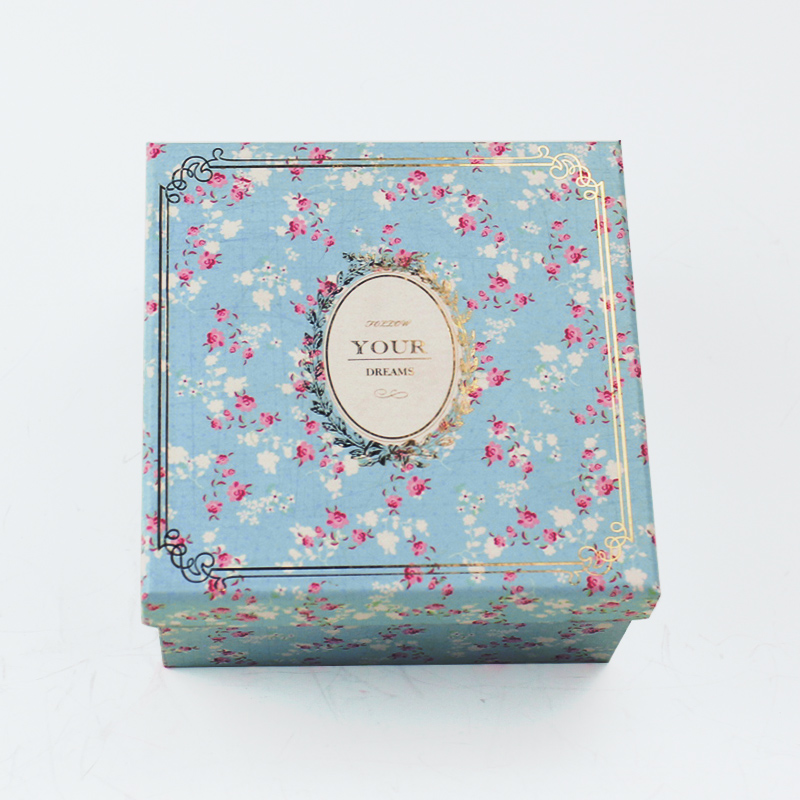 C'est un boîte en papier avec couvercle qui a fait en papier d'art C2S 157g + carton gris 1200g, la boîte pleine de petites fleurs imprimées sur la boîte avec une bordure estampée en feuille d'or autour de la boîte et du papier spécial rouge à l'intérieur de la boîte.