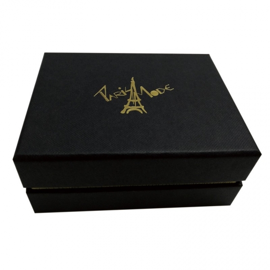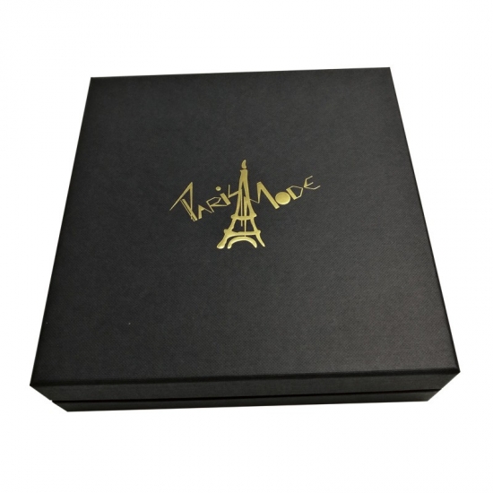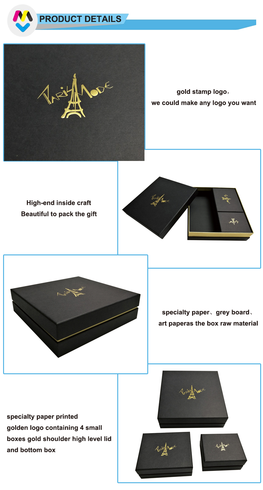 Il s'agit d'un ensemble de grandes boîtes rigides noires de luxe avec un petit couvercle d'emballage cadeau et une boîte de base, chaque boîte étant fabriquée en papier noir spécial + carton gris 1200g et le logo est en feuille d'or sur les couvercles supérieurs.
