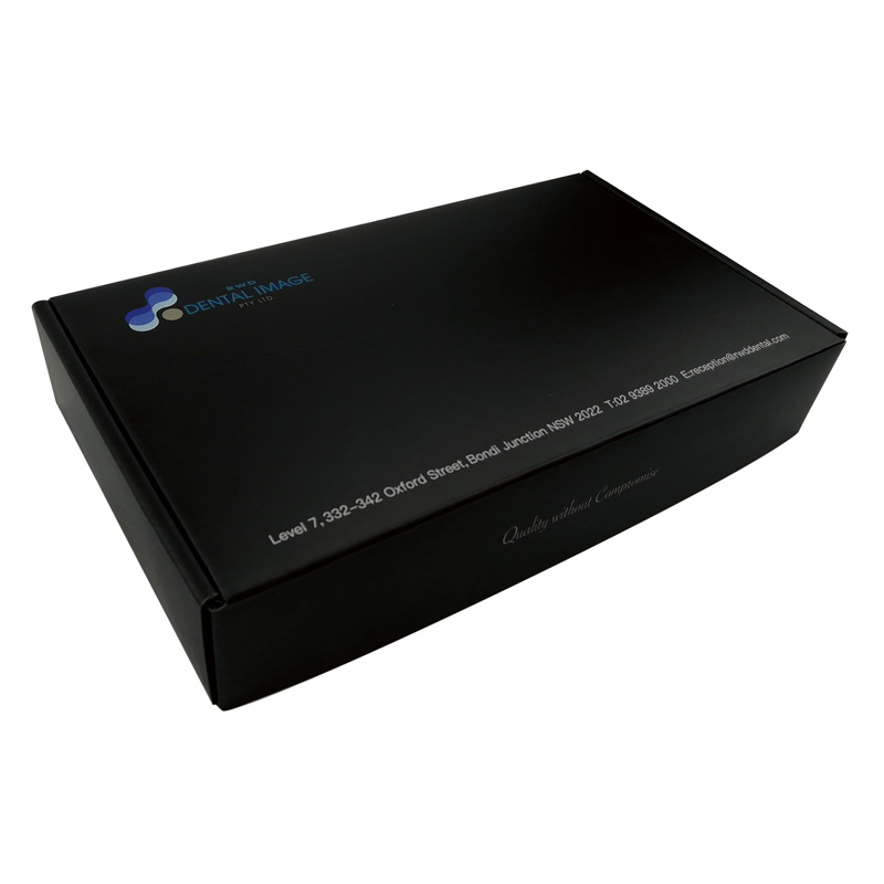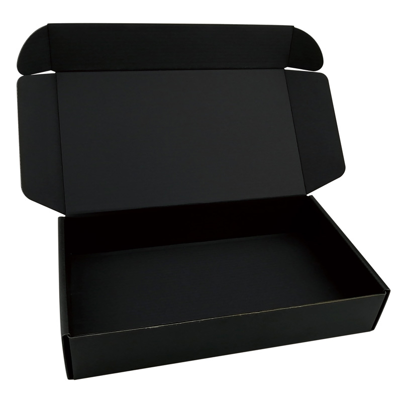 C'est un emballage en carton ondulé noir boîtes fabriqué à partir de 250 g de CCNB + BE flûte + papier noir, c'est un style simple de boîte d'expédition dont l'intérieur et l'extérieur sont de couleur noire, logo personnalisé imprimé à l'extérieur de la boîte avec finition mate.