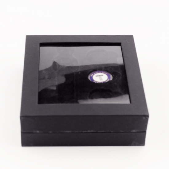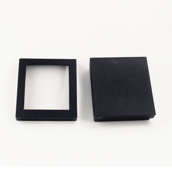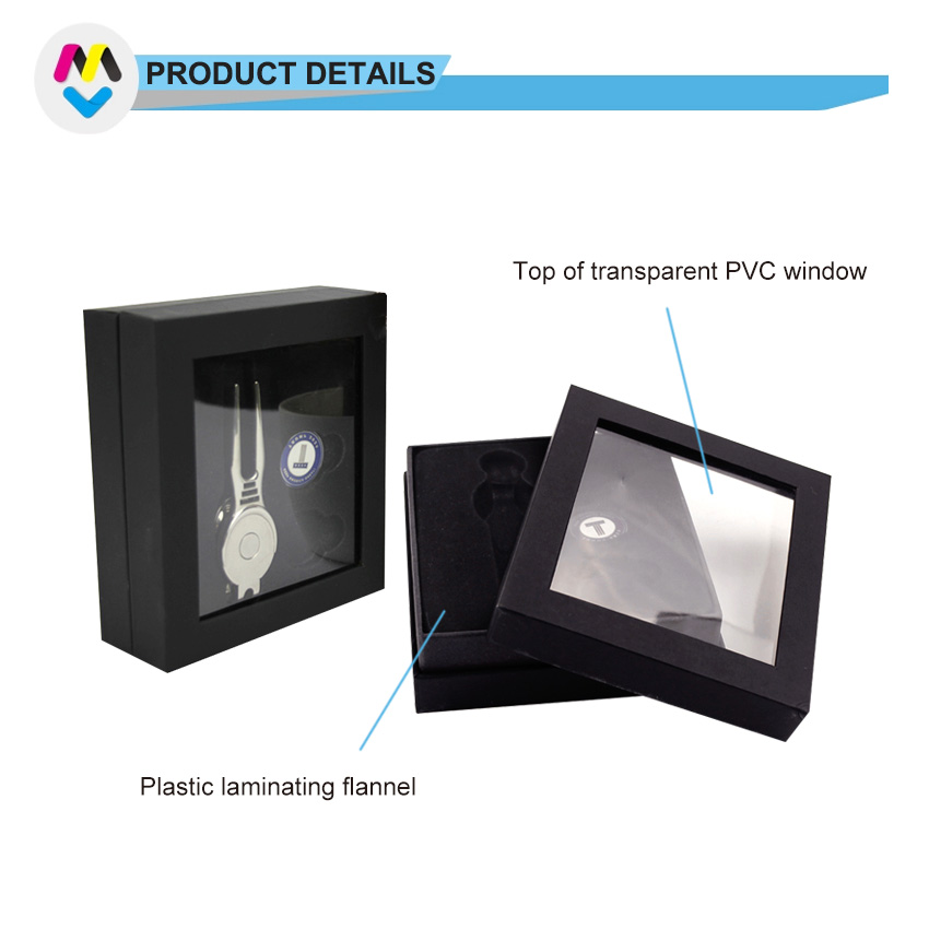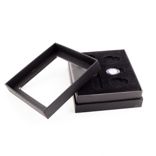 Il s'agit d'une boîte en carton décorative noire personnalisée avec couvercle en PVC transparent, fabriquée à partir de papier spécial noir + carton gris de 2 mm, à l'intérieur se trouve un tissu en velours noir recouvrant l'insert blister qui lui donne un aspect très haut de gamme et luxueux.