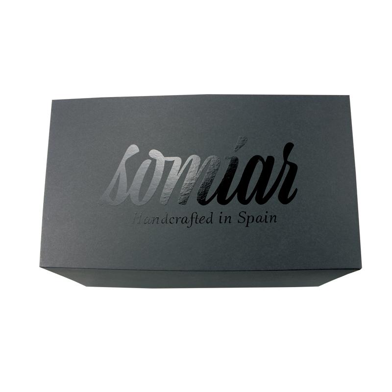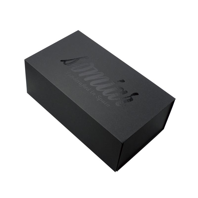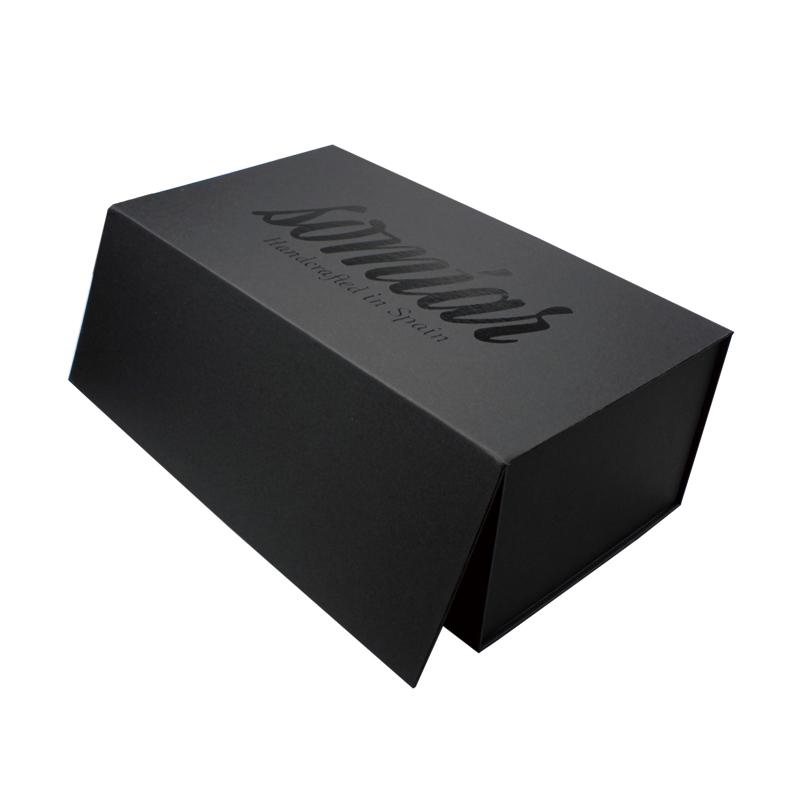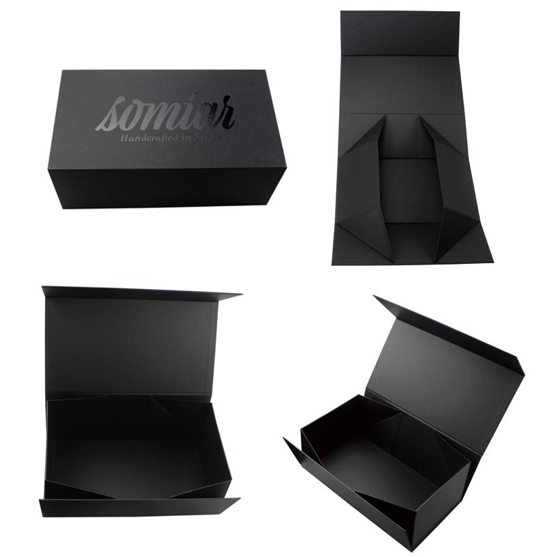 C'est une couleur noire boîtes en carton pliantes qui a fait en papier spécial noir + carton gris 1200g, revêtement UV du logo sur le dessus du couvercle, les deux côtés de la boîte sans aucune impression.