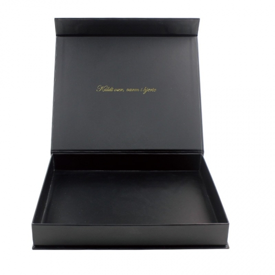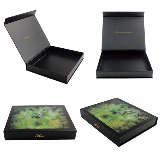 Il s'agit d'un coffret cadeau noir personnalisé avec fermeture magnétique qui a fait en papier d'art C2S 157g + carton gris 1200g, c'est une boîte noire mate décorative dont l'extérieur est imprimé en couleur et le logo à l'intérieur de la boîte est estampé à la feuille d'or.