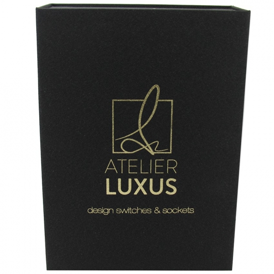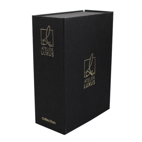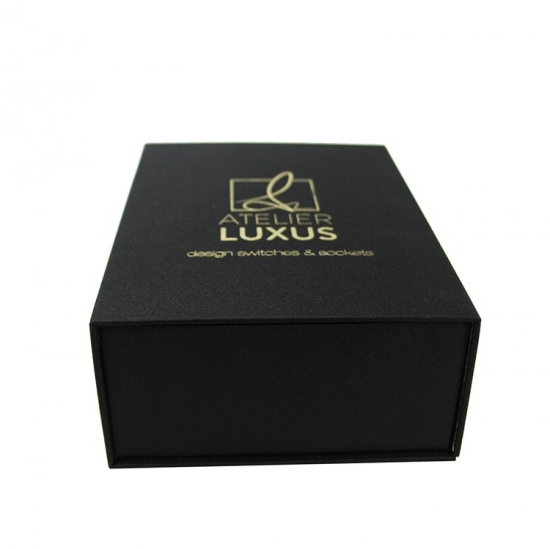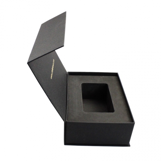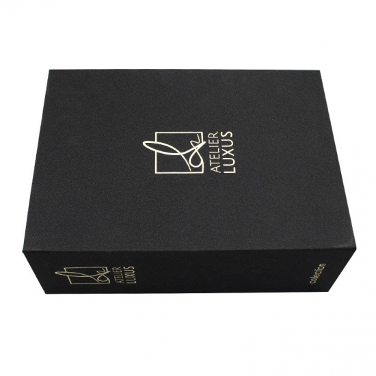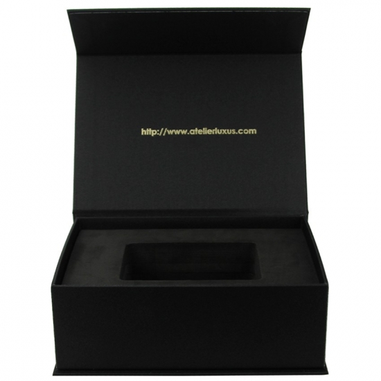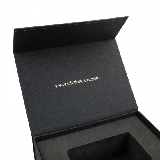 Il s'agit d'une boîte à rabat magnétique noire avec rembourrage en mousse EVA qui a fait Papier spécial à motif en tissu + carton gris 1200 g, et le logo à l'intérieur et à l'extérieur est estampé à la feuille d'or.