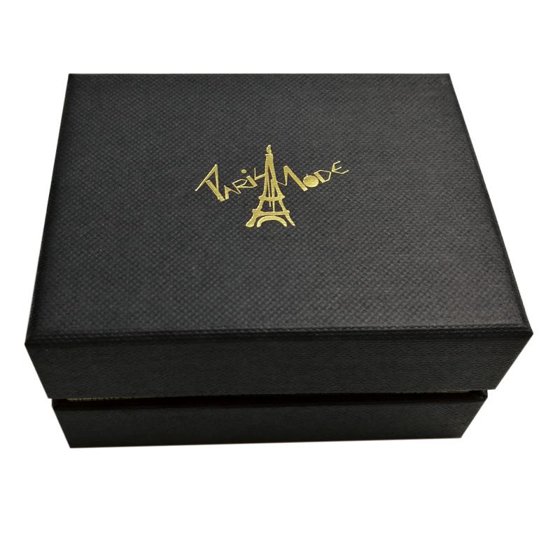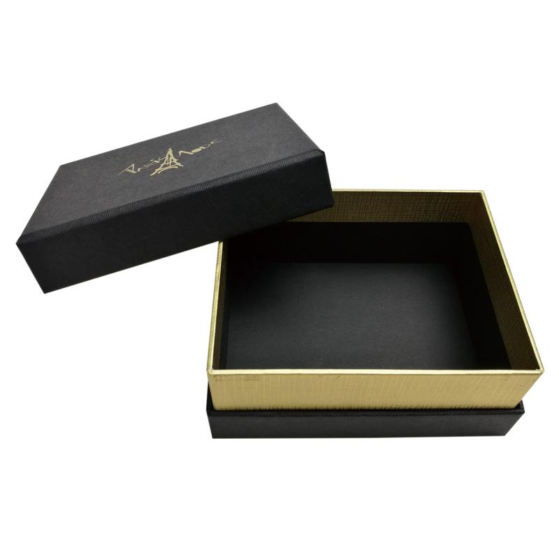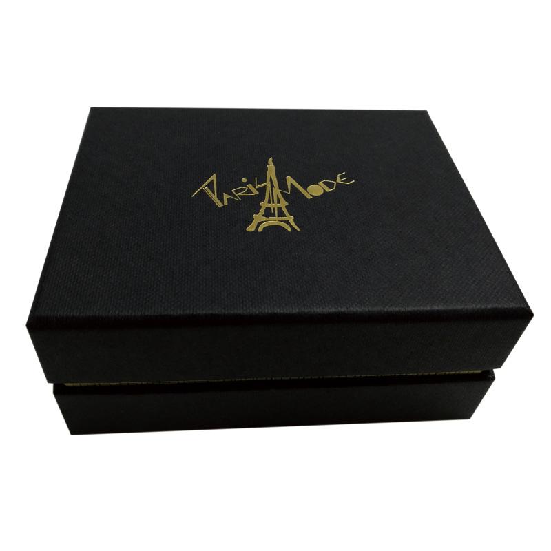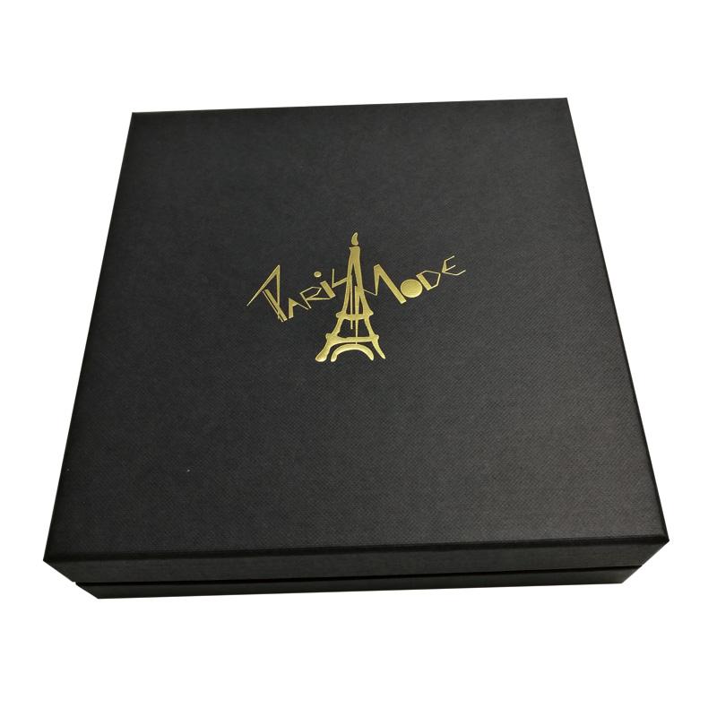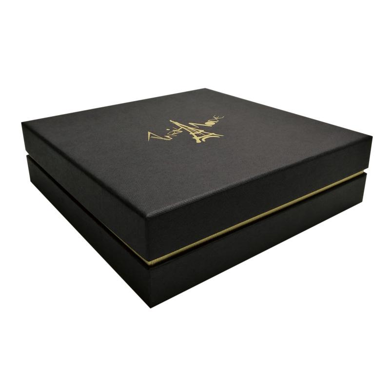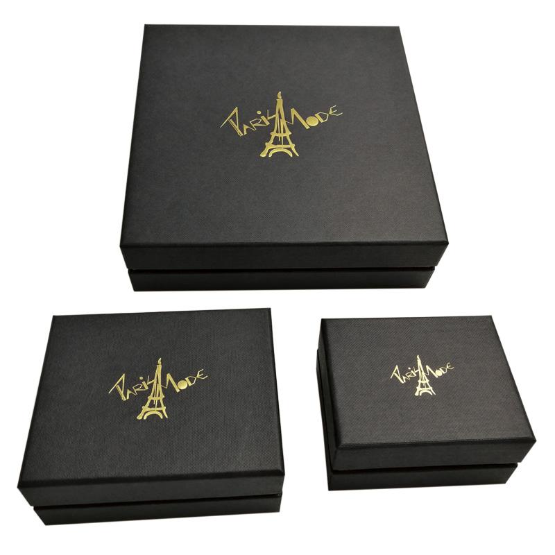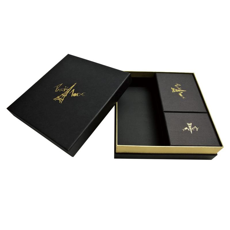 Il s'agit d'un ensemble de luxe couvercle et fond de boîte noirs qui a fait en papier texturé spécial + carton gris 1200 g, le revers de la base en papier spécial doré et le logo sur le dessus de la boîte sont estampés à la feuille d'or. Il y a une grande boîte pour contenir 3 boîtes plus petites de tailles différentes.