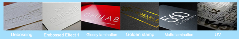 Il existe des modèles laminés mats/brillants, estampés à chaud, en relief/en creux, UV, etc.