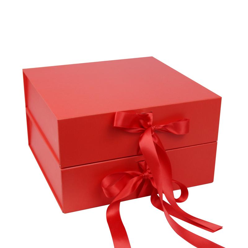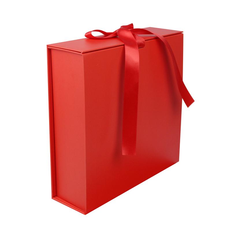 Classique Boîte à cravates en ruban Fabriqué en papier d'art C2S monté sur carton rigide 1200 g/m², avec fermeture aimantée et ruban. Surface extérieure rouge unie. Logo personnalisé à l'intérieur du couvercle, pour une interrogation sur le contenu. Autocollants 3M sur les coins, utilisable comme une boîte magnétique classique en forme de livre.