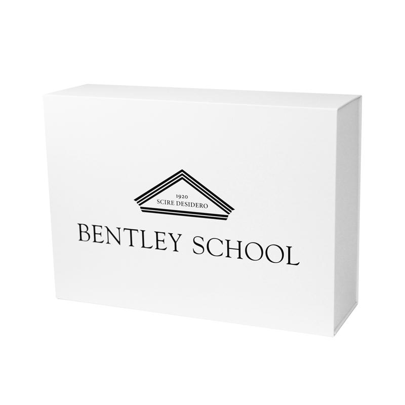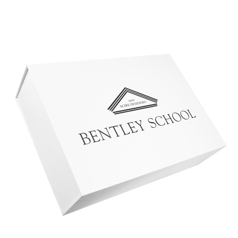Coffret cadeau blanc mat avec logo personnalisé imprimé en noir, adapté à tous les types d'emballages cadeaux haut de gamme.