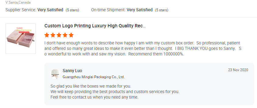 Après cela, Jonathan m'a présenté son patron, Virginia. Nous avons eu une conversation agréable et confirmé tous les détails de la boîte à tiroirs coulissante avec des pochettes en satin. Nous avons terminé l'échantillon en une semaine, j'ai envoyé des vidéos et des images à Virginia pour confirmer l'échantillon.