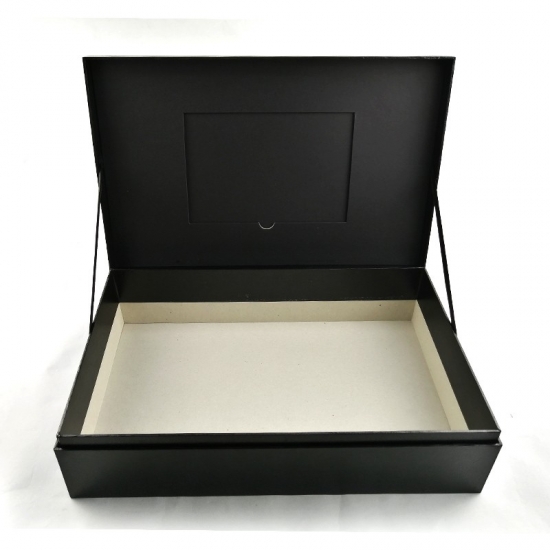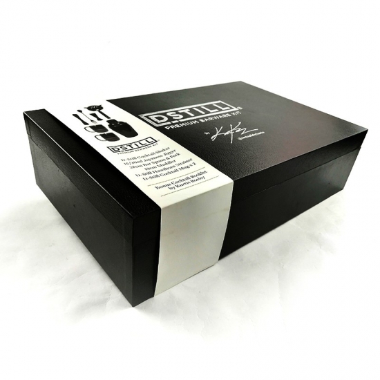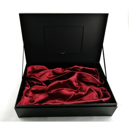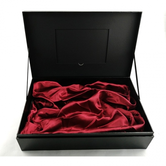 C'est un coffret cadeau à clapet noir qui a fait en papier d'art C2S 157g + carton gris 2mm, le logo à l'extérieur de la boîte est estampé en feuille d'argent qui pourrait rendre la boîte plus haut de gamme et unique, l'intérieur de l'insert de la boîte est en satin de bonne qualité qui décore les produits à l'intérieur de la boîte.