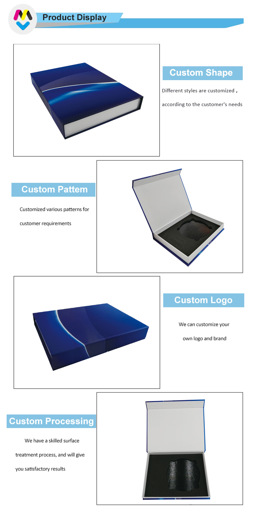 Boîte d'emballage magnétique bleue d'apparence classique, mystérieuse et élégante. Son intérieur en EVA de haute qualité permet une personnalisation optimale. Convient à tous types de coffrets cadeaux, cosmétiques, bijoux, etc.