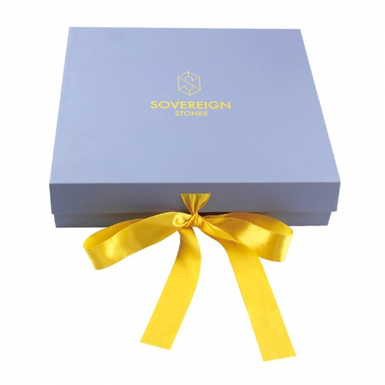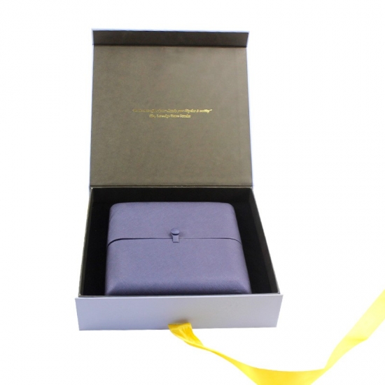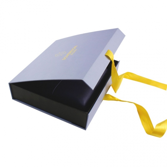 Les boîtes cadeaux magnétiques bleues avec ruban ont été fabriquées en papier d'art C2S 157 g/m² laminé avec du carton gris de 2 mm avec de la mousse EVA et du ruban, support personnalisé de n'importe quelle taille, couleur et logo, la finition de surface était une lamination mate, un estampage à chaud, taille 25*23*6 cm