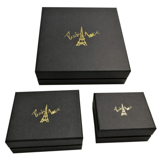 Coffret personnalisé dans une petite boîte à l'intérieur avec couvercle à manchette dorée et boîte de base, fabriqué en papier spécial noir + carton gris 1200 g, l'estampage à la feuille d'or du LOGO correspond bien à la couleur de la manchette dorée.Utilisation : tous types de produits et emballages cadeaux, parfums, bijoux, cosmétiques, vêtements, etc.