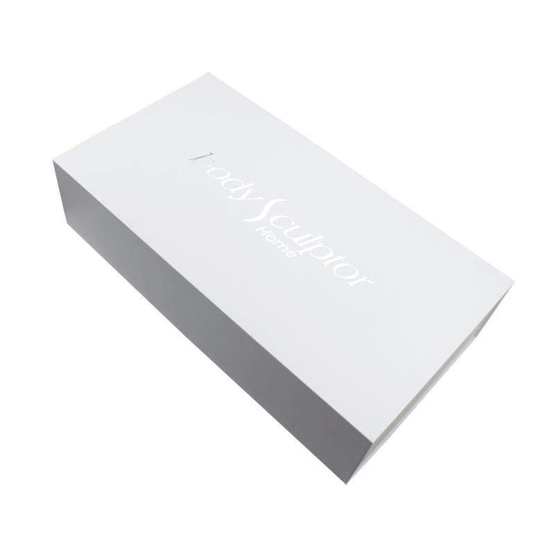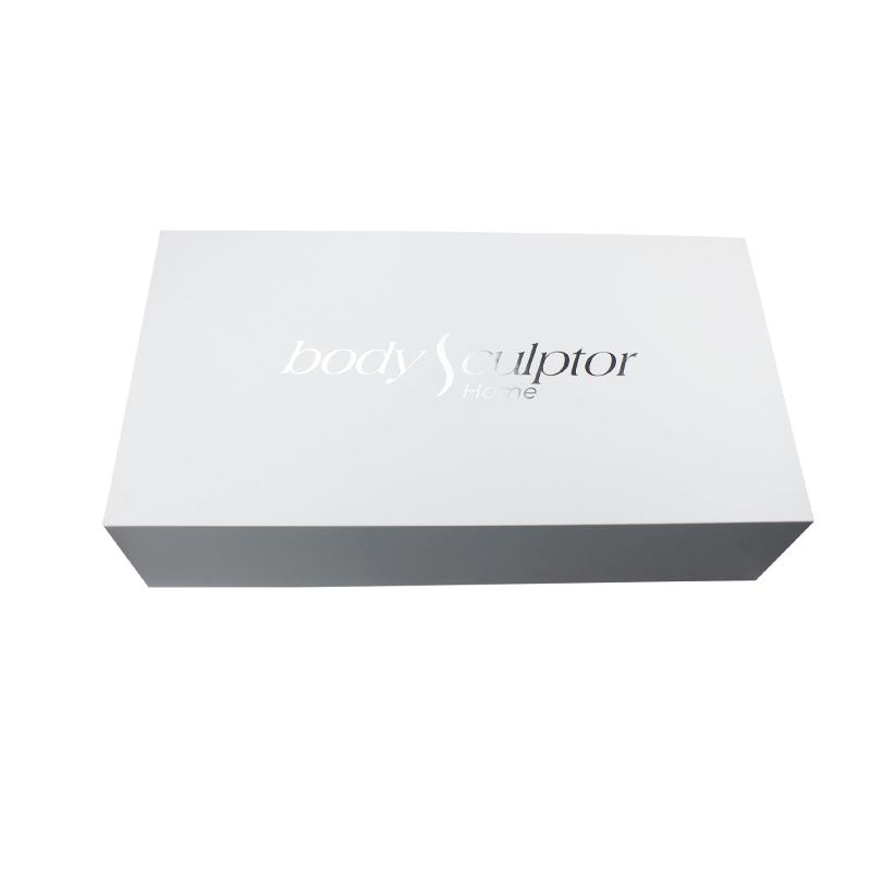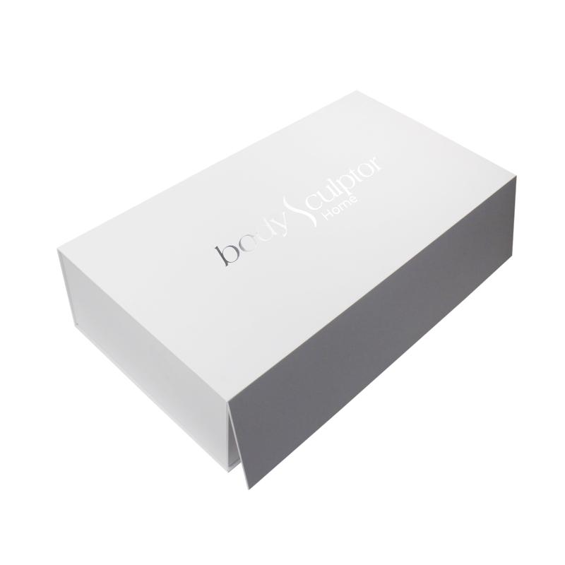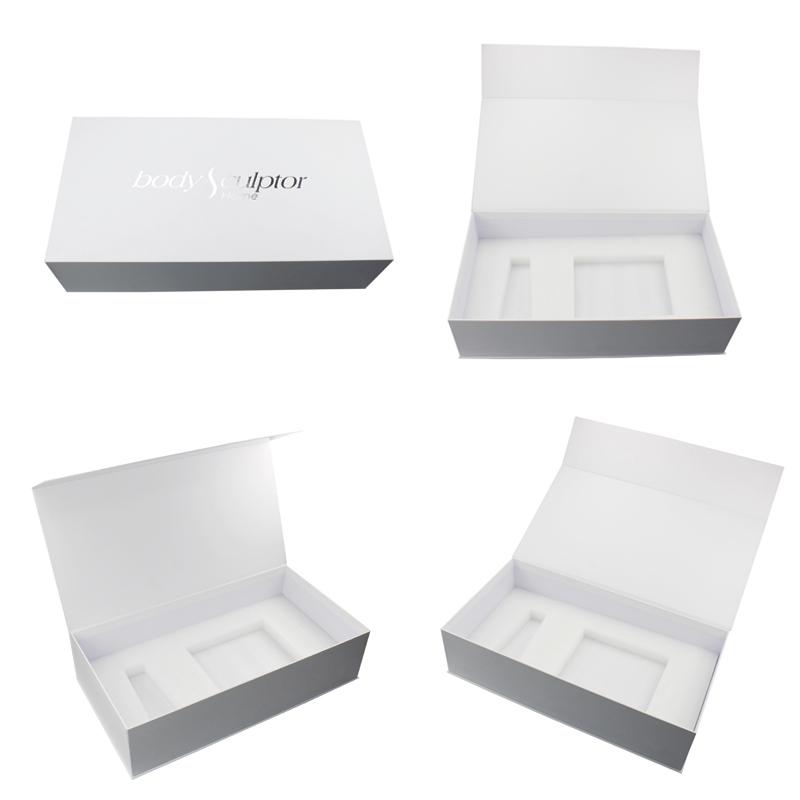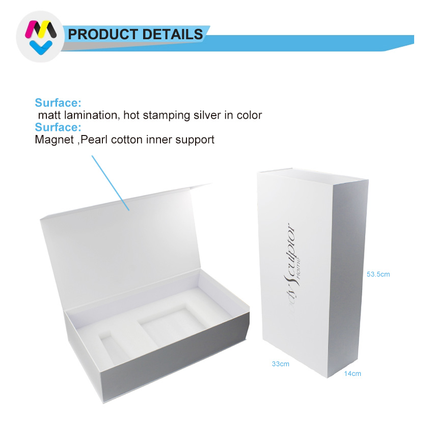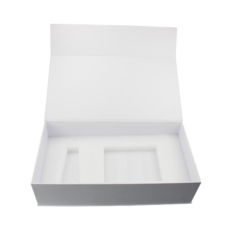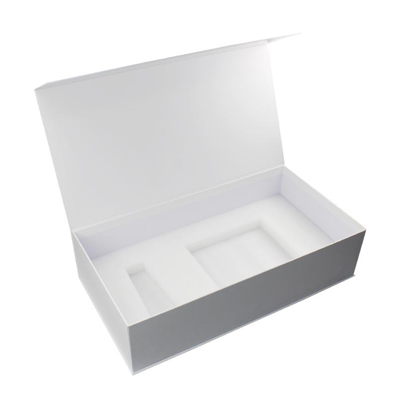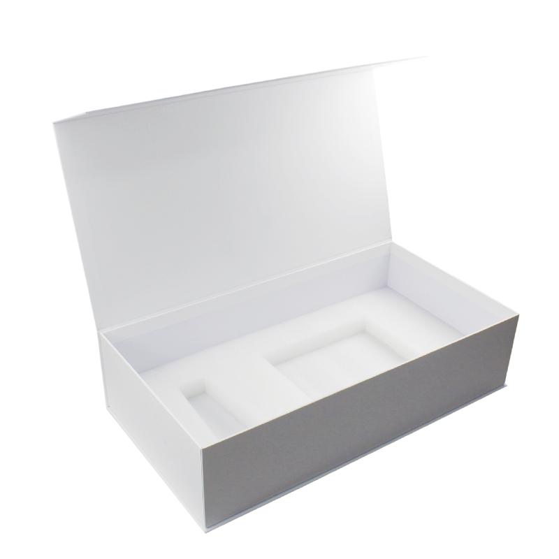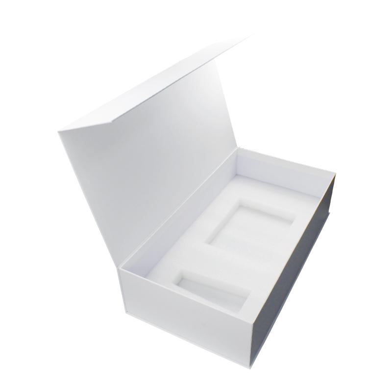 Il s'agit d'un emballage cadeau à clapet blanc simple et soigné avec fermeture magnétique, fabriqué en papier d'art C2S 157 g + carton gris 1200 g. logo estampé en feuille d'argent avec insert en mousse PE blanche.