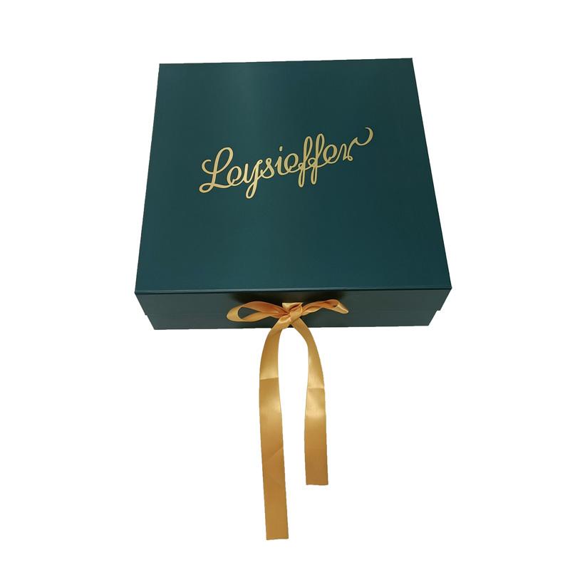 Luxe Boîte en papier pliable magnétique Fabriqué en papier d'art 157 g/m² contrecollé sur carton rigide, il est imprimé en bleu foncé Pantone sur toute la surface et porte un logo personnalisé en or Pantone. La fermeture est assurée par un aimant et un ruban adhésif 3M aux quatre coins. Il est notamment utilisé pour l'emballage de chaussures. emballage cadeau de boutique .