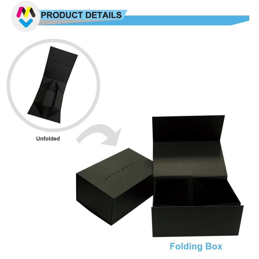 Cette boîte est fabriquée en carton noir 120 g/m² laminé avec du carton rigide premium 1200 g/m². De style boîte cadeau pliante, elle est très magnétique, avec un vernis UV et un logo gravé en creux sur le couvercle et le site web en dessous. Simple et d'un style classique.