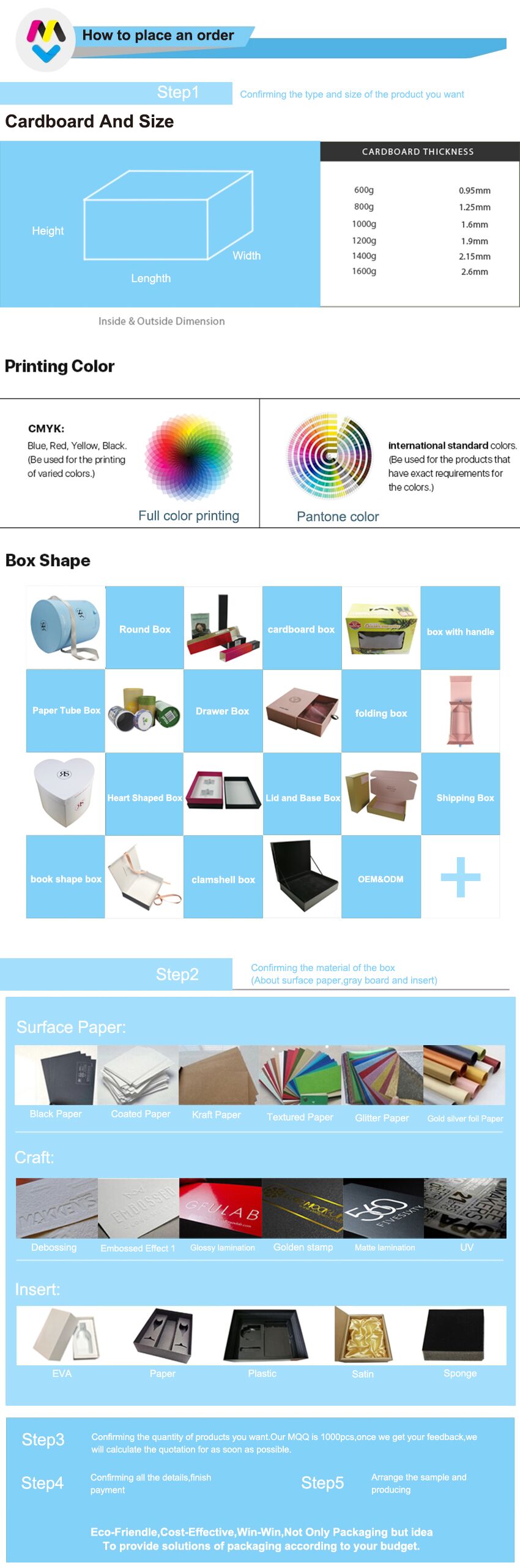 Remarque : Toutes ces photos de produits que nous avons publiées sur notre site Web sont uniquement à titre de référence sur le type d'emballage que nous pouvons fabriquer, cela ne signifie pas que nous vendons le même que le stock. Nous nous concentrons sur la personnalisation de toute taille/couleur d'impression/structure d'emballage en papier, etc.