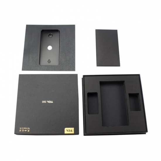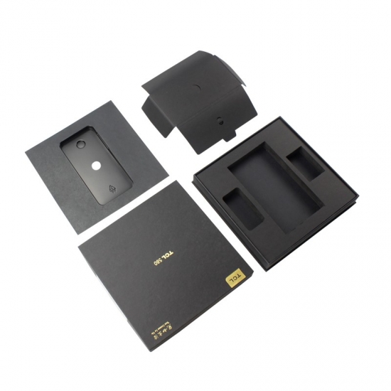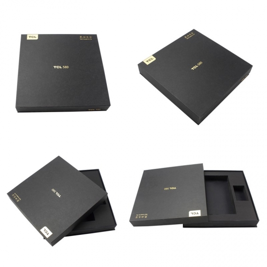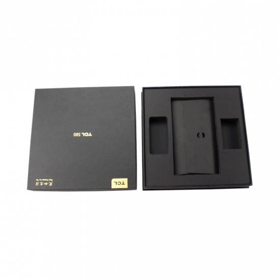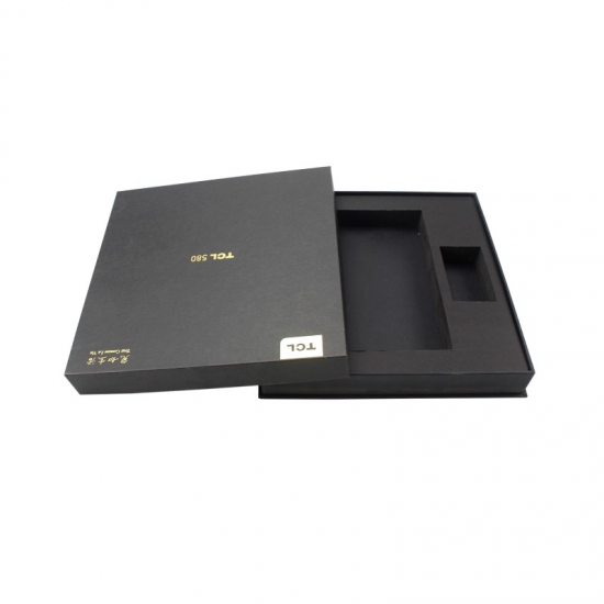 Il s'agit d'un grand coffret cadeau personnalisé en carton pour téléphone portable avec couvercles, fabriqué en papier cartonné noir + carton gris 1200 g, logo personnalisé estampé en feuille d'or, l'intérieur de la boîte a un insert de séparation en mousse EVA noire solide pour maintenir le téléphone et le séparer des accessoires.