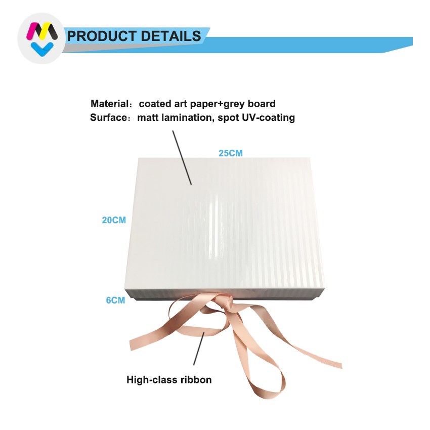 Coffret cadeau magnétique blanc avec fermeture à ruban réalisé en papier d'art C2S 157 g/m² laminé avec du carton gris de 2 mm avec support en ruban personnalisé de n'importe quelle taille et couleur, la finition de surface était un laminage mat et un revêtement UV sélectif