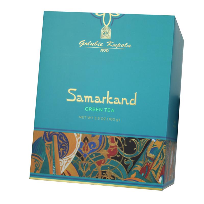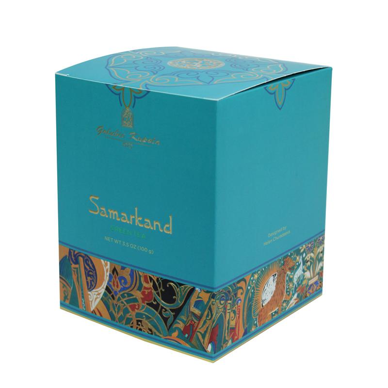 Cette boîte est fabriquée en carton 300 g/m² avec un motif imprimé en couleur. Le nom de la marque est mis en valeur par un gaufrage doré et un marquage vert pour le nom du thé. Différents coloris de feuille sont disponibles pour personnaliser votre message.