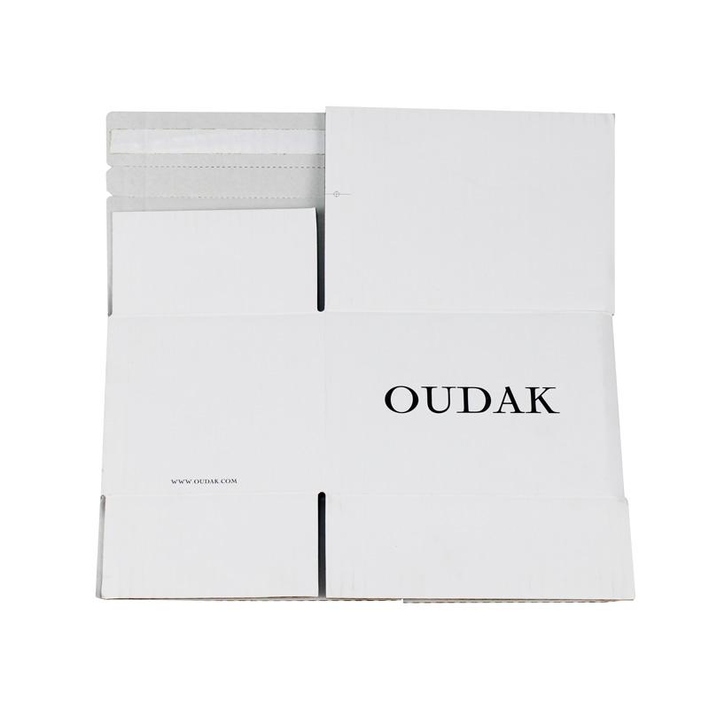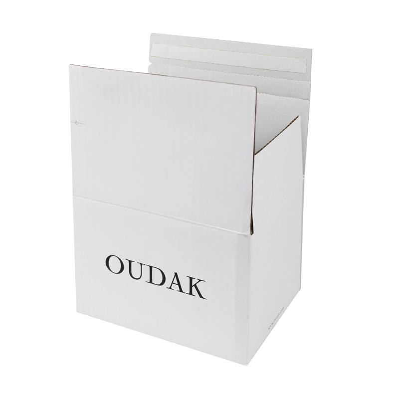 Fantaisie Boîtes d'expédition faciles à fermer Fabriqué en carton ondulé blanc 300 g/m² CCNB laminé triple épaisseur. Logo extérieur imprimé noir mat. Intérieur en carton blanc uni, avec fermeture par ruban adhésif double face. Fermeture par ruban adhésif autocollant et ouverture facile grâce à la ligne perforée.