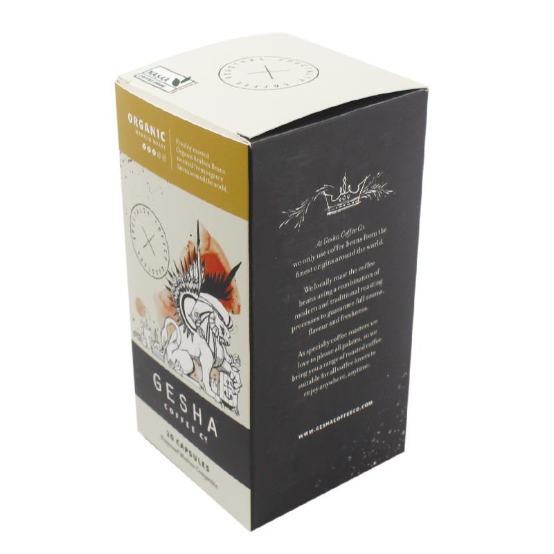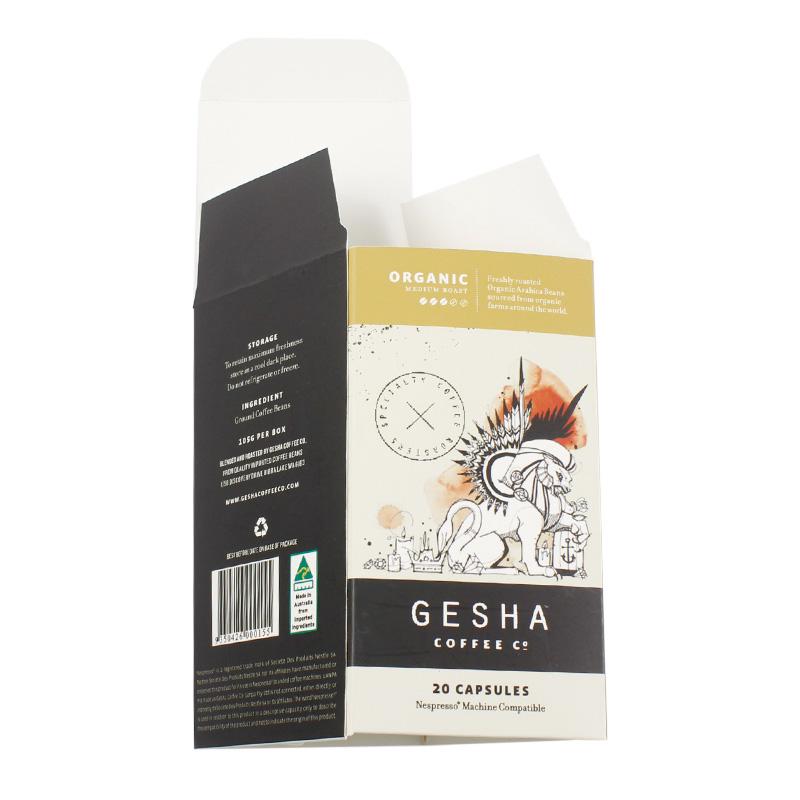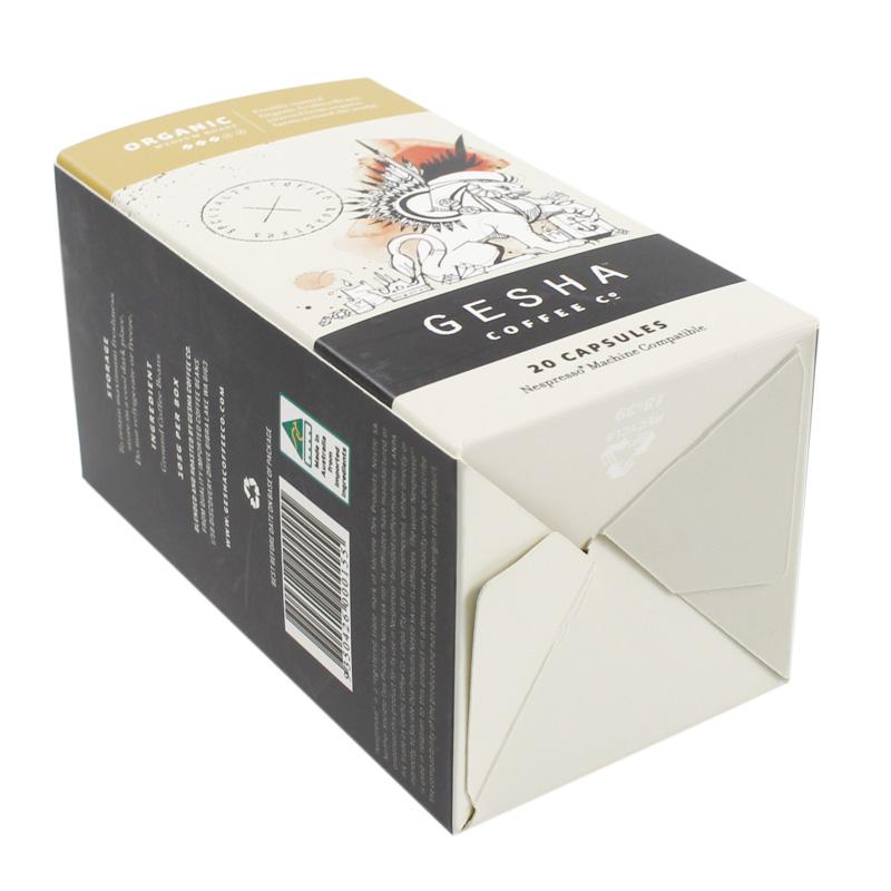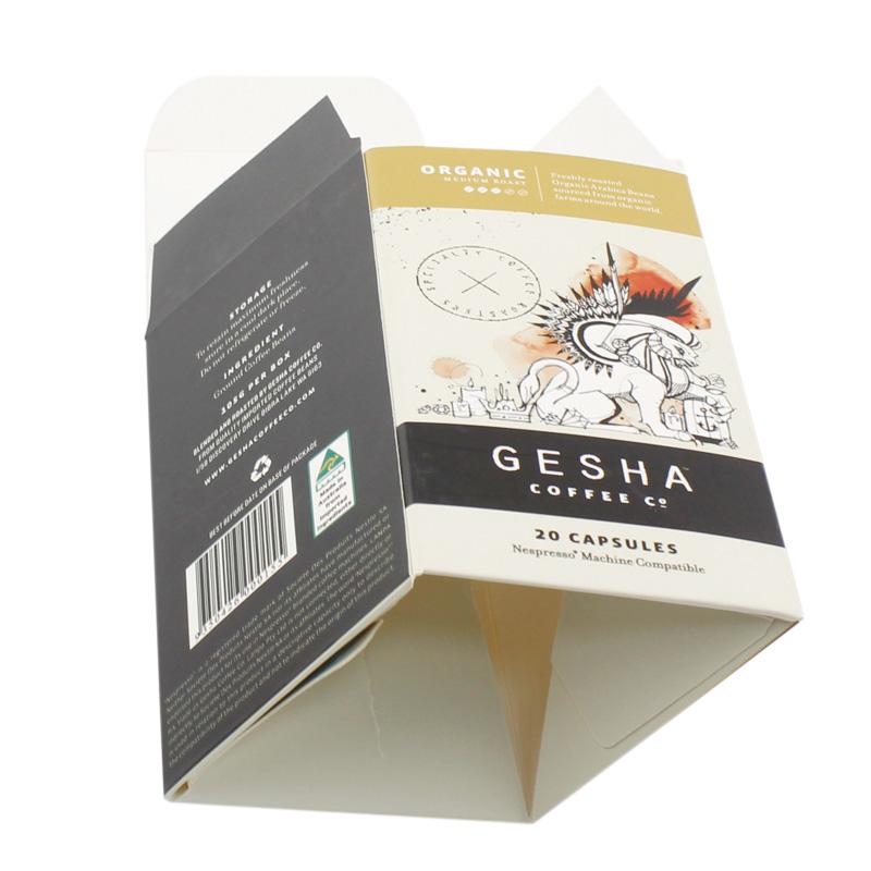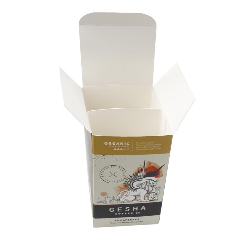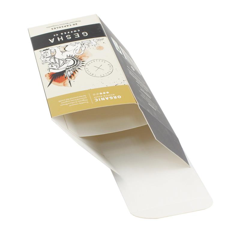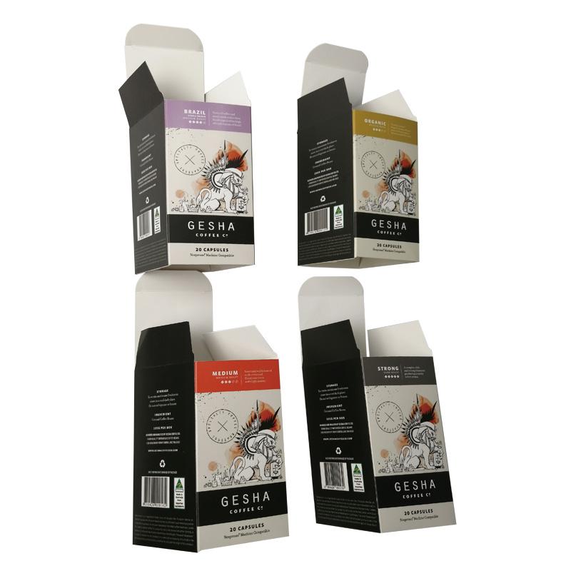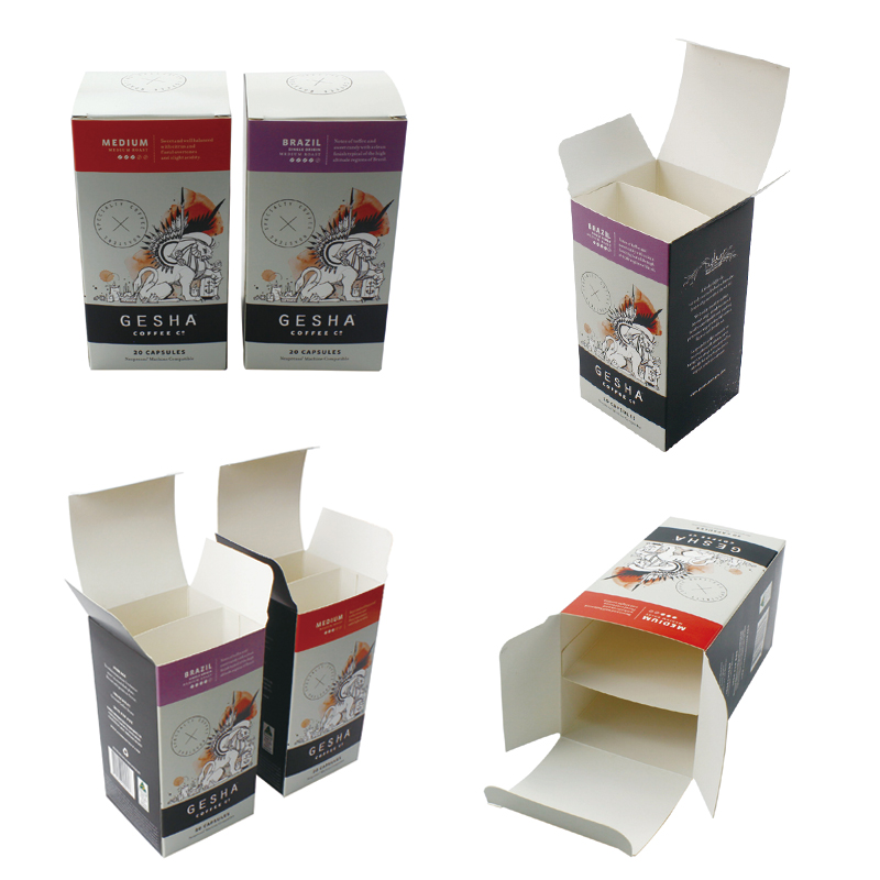Cette boîte à fond automatique est fabriquée en carton blanc 350 g/m², avec impression CMJN 4C et gris Pantone, et vernis mat. Elle est utilisée pour l'emballage de cafés compressés. Chaque produit présente un motif d'impression différent. Ce type de boîte en carton souple est généralement utilisé pour l'emballage de petits produits, comme les médicaments, les flacons de cosmétiques, etc.