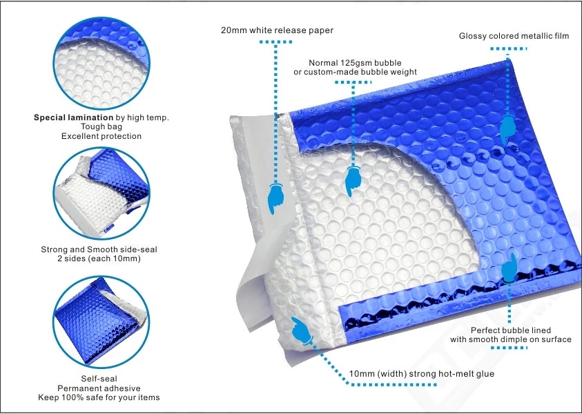 Matériau du produit : film aluminisé + bulle de polyéthylène. La couleur et le contenu de l'impression sont personnalisables.