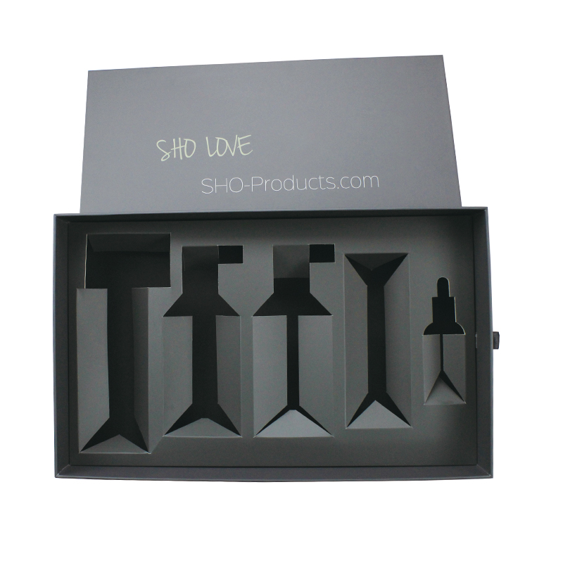 C'est un boîte à tiroirs en carton avec tire-ruban qui a fait par papier d'art C2S 157g + carton gris 1200g ,plein d'impression à l'extérieur et à l'intérieur de la boîte, il y a des inserts en carton papier qui ont une forme personnalisée en fonction des produits à l'intérieur de la boîte.