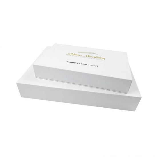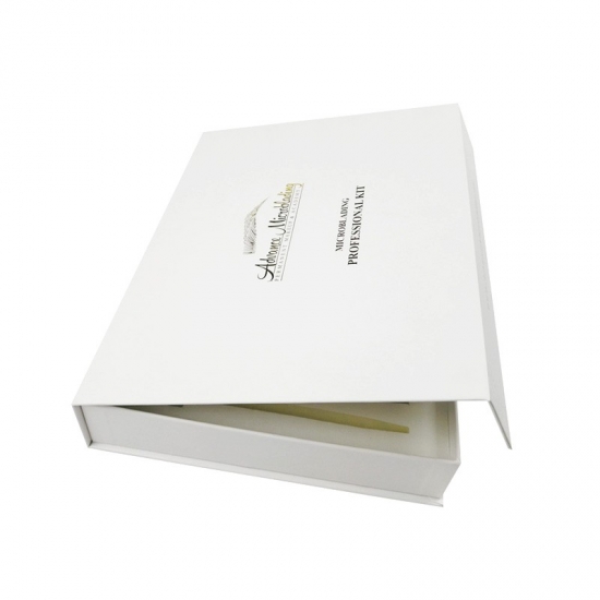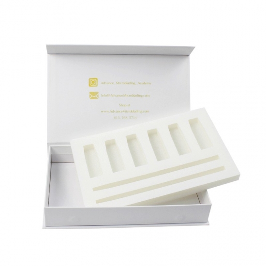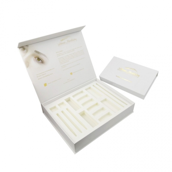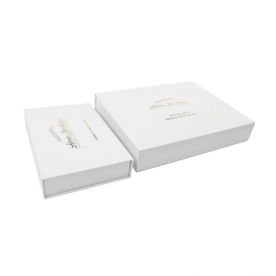 La boîte à rabat magnétique blanche avec marquage à chaud a été fabriquée en papier d'art C2S 157 g/m² laminé avec un carton gris de 2 mm, l'intérieur est en mousse éponge personnalisée de n'importe quelle taille, couleur et logo, la finition de surface était une laminage mat, marquage à chaud doré taille 24*15,5*4 cm