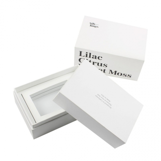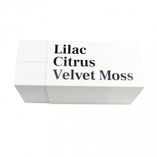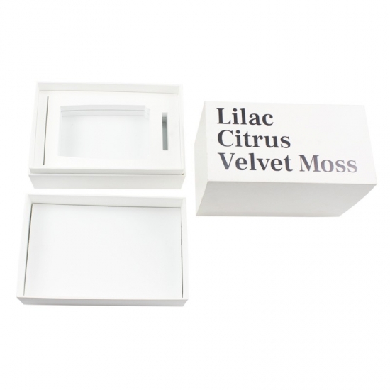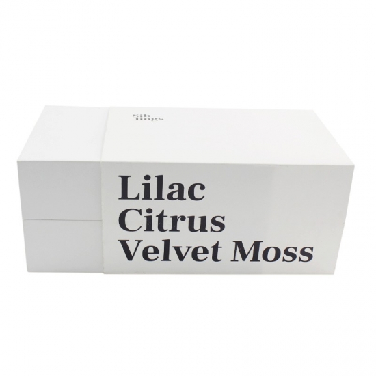 La boîte est fabriquée en papier d'art 157 g et carton gris. Elle mesure 29 cm de long, 17 cm de large et 11 cm de haut. Un texte personnalisé est imprimé sur un côté et un logo noir orne le couvercle.