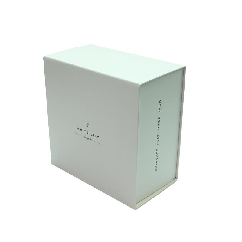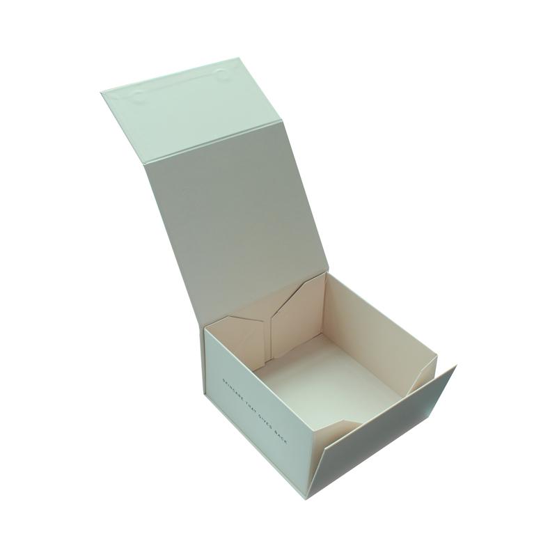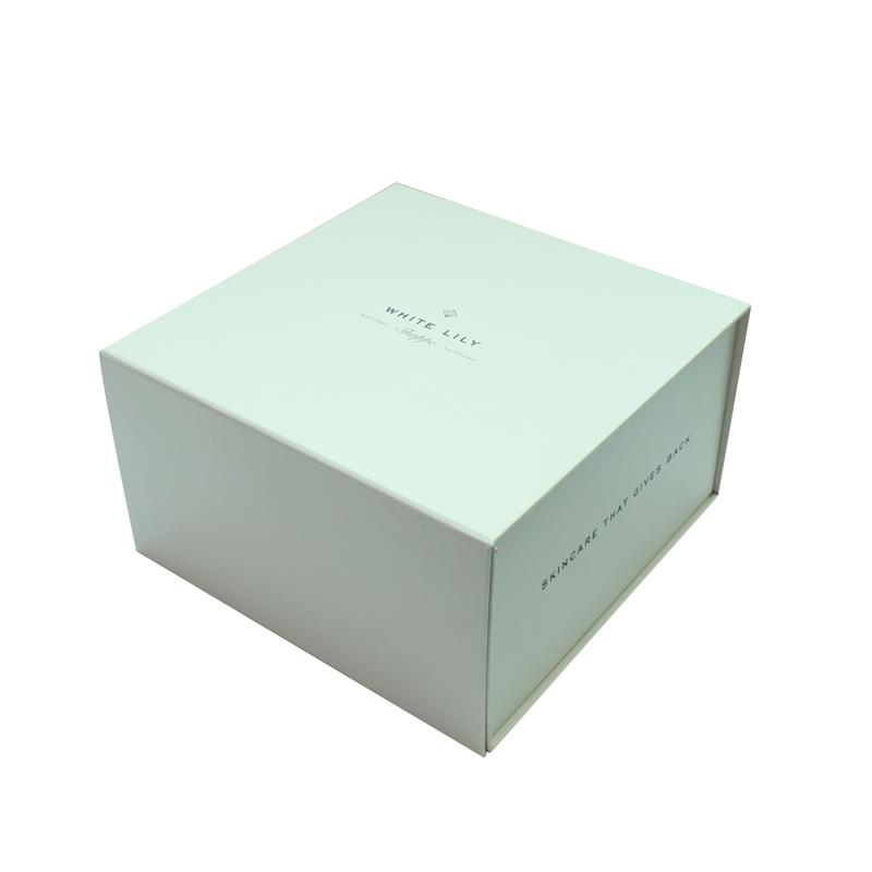 Cette boîte rigide pliable est fabriquée en papier couché 120 g/m² laminé sur du carton gris premium de 2 mm. Son impression pantone rose clair et son logo noir lui confèrent une impression de romantisme et de luxe.