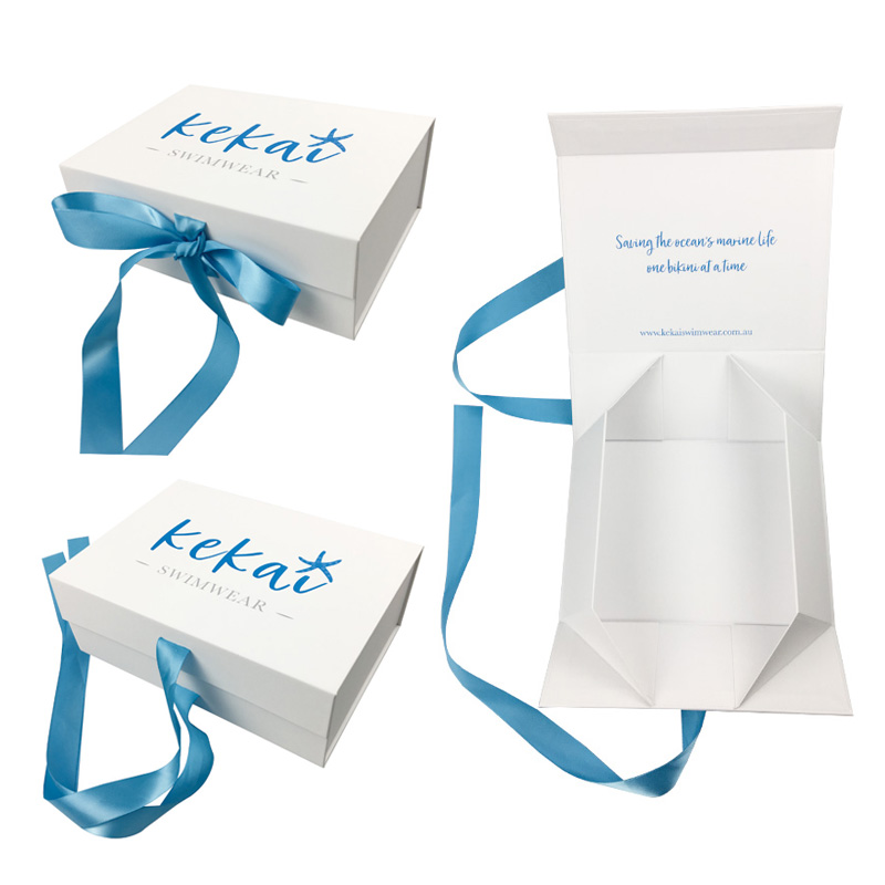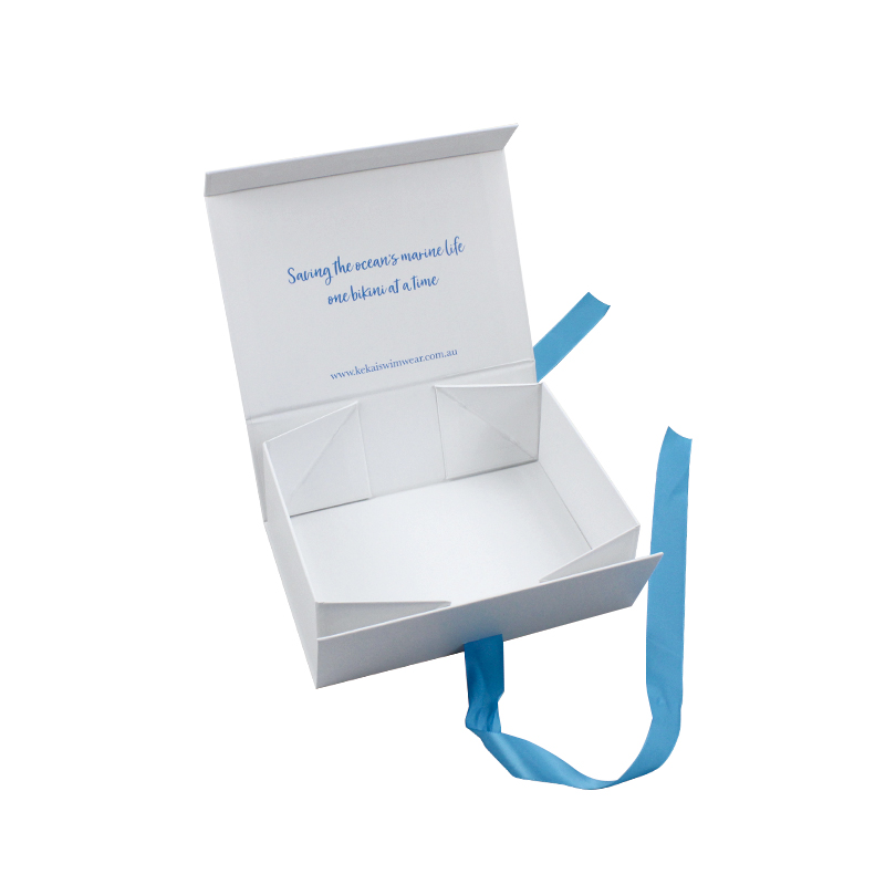 C'est un boîtes cadeaux magnétiques pliables qui a fait par papier d'art 157g + carton gris 1200g, le logo imprimé à l'extérieur de la boîte et la fermeture du ruban attaché correspondent à la couleur du logo bleu, à l'intérieur du couvercle impriment quelques instructions pour les produits. Nous pouvons personnaliser la taille selon votre demande.