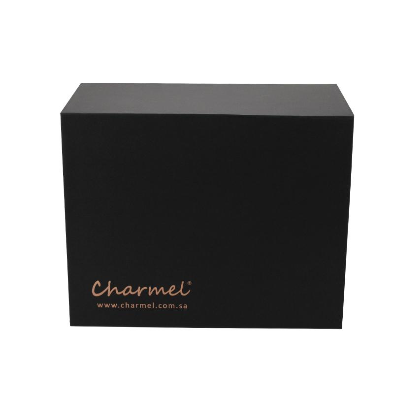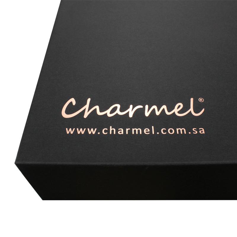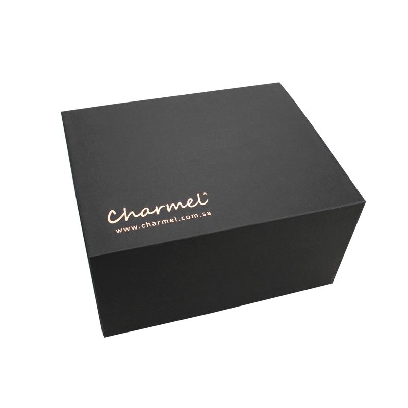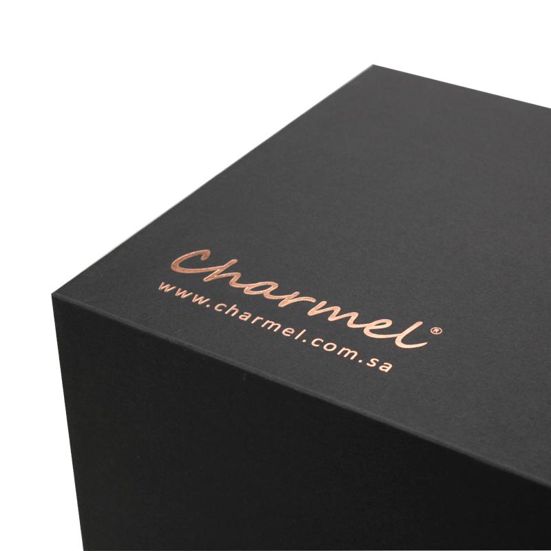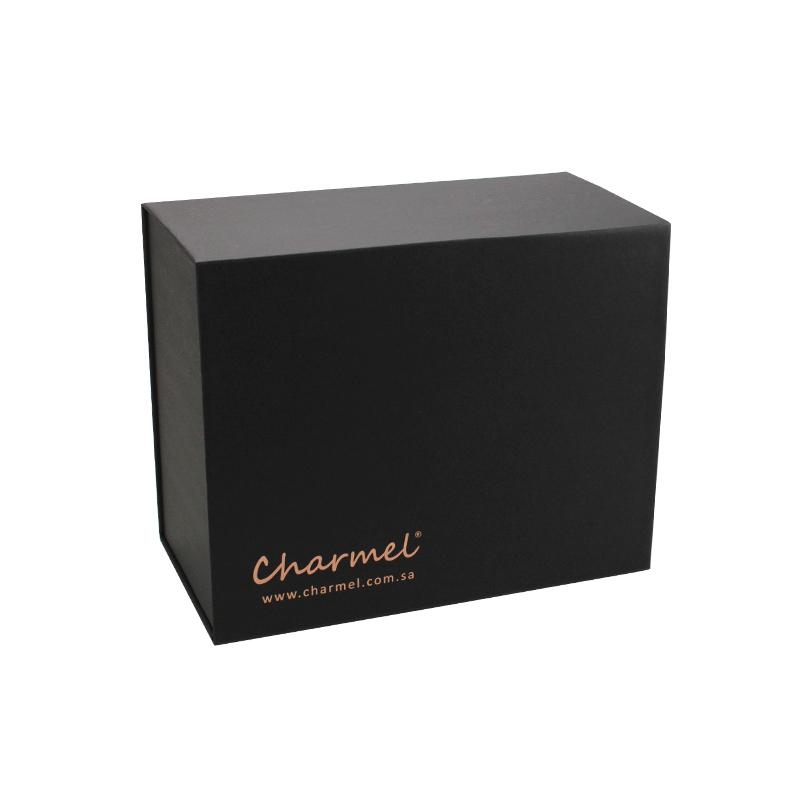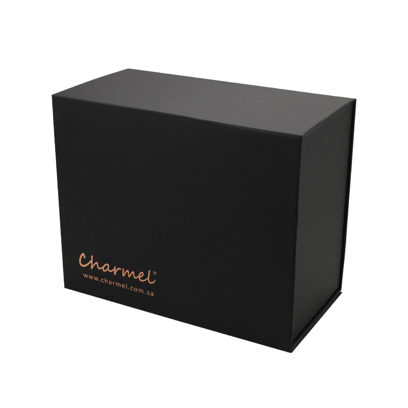 C'est un noir boîtes d'emballage magnétiques pliables qui a fait en papier noir spécial + carton gris 1200g, le logo sur le coin du couvercle supérieur est estampé en feuille d'or rose. Nous pouvons personnaliser la taille et le logo selon votre demande.