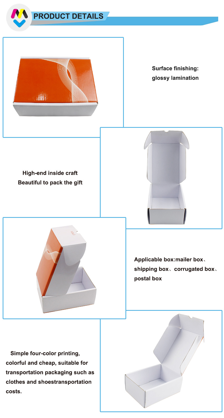C'est un boîtes cadeaux en carton ondulé brillant Fabriqué à partir de flûte CCNB + WE de 300 g, ce sont des boîtes-cadeaux en carton ondulé pour la vente en gros personnalisée : l'extérieur est imprimé en couleur avec une finition de surface brillante et l'intérieur est blanc uni sans impression.