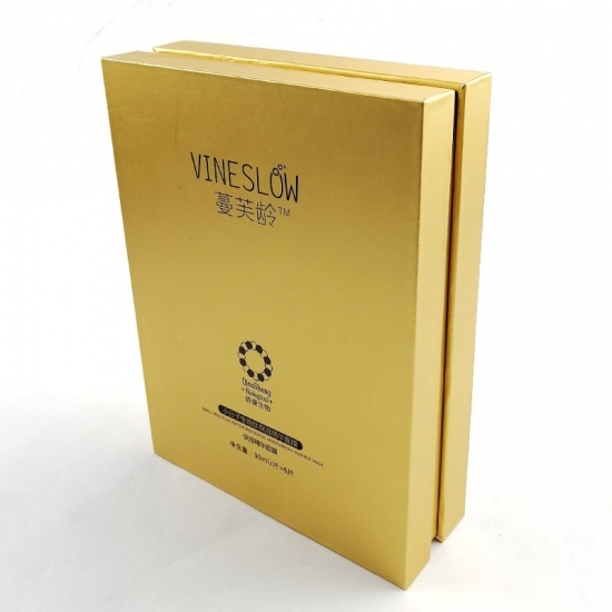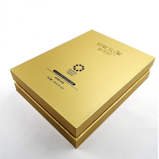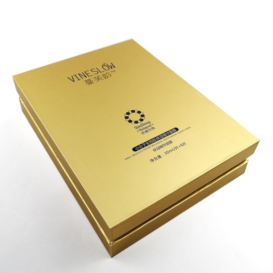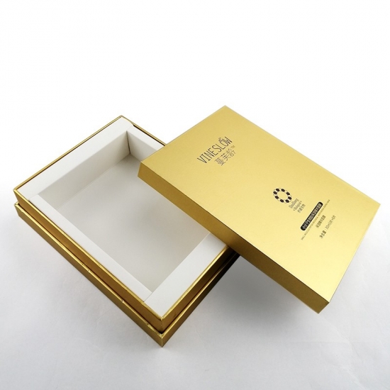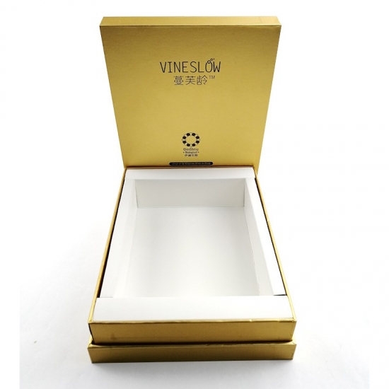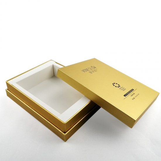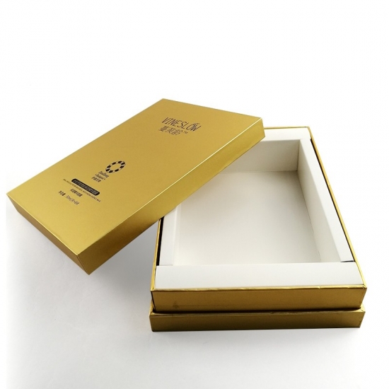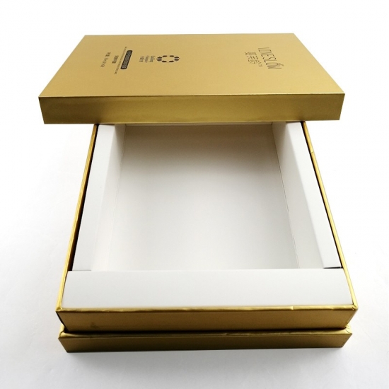 Il s'agit d'une grande boîte cadeau avec couvercle et base à logo noir fabriquée par papier spécial doré + 1200 g de carton gris, l'intérieur de la boîte comporte un insert de rembourrage en carton.