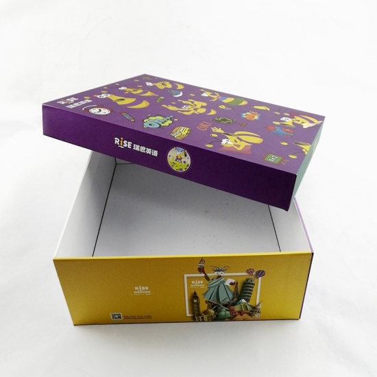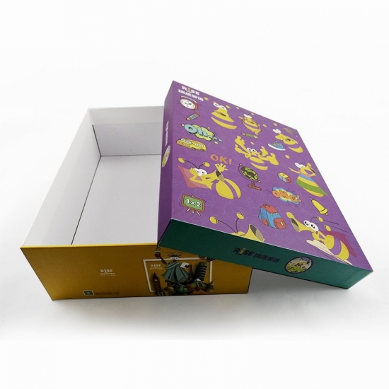 Il s'agit d'une grande boîte cadeau rectangulaire à motifs colorés avec couvercles fabriqués par papier d'art C2S 157g + carton gris 1200g, pelliculage mat à l'intérieur couleur unie blanche.