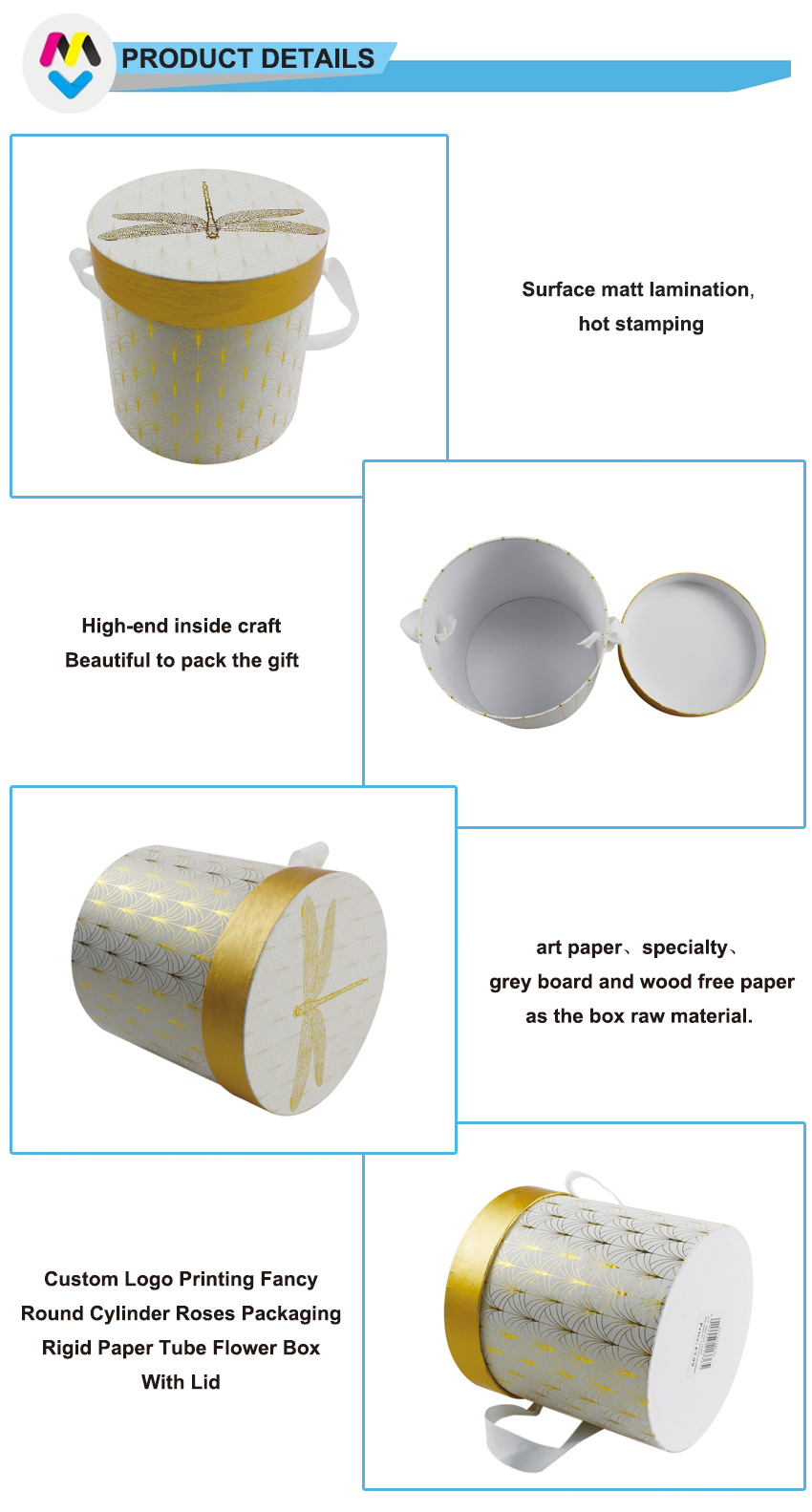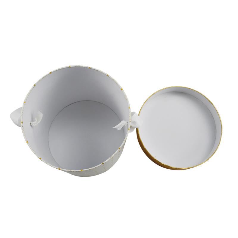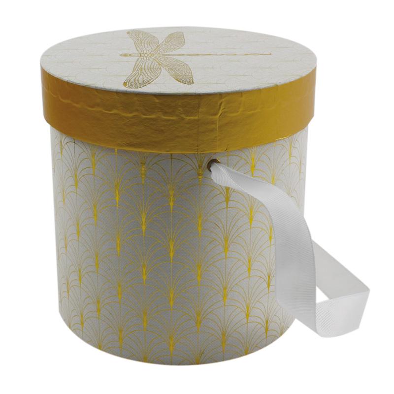 Il s'agit d'une grande boîte cadeau ronde décorative à motifs magnifiques avec un dessus et un dessous en papier d'art C2S 157 g + un carton gris 1200 g, le logo libellule est sur le couvercle pour rendre la boîte réaliste et avec une poignée en ruban facile à emporter.