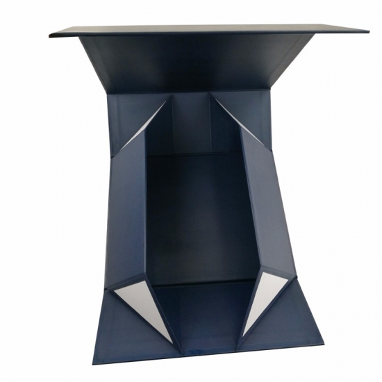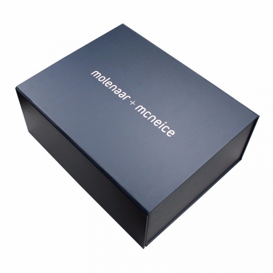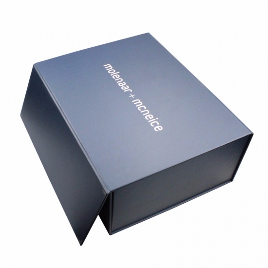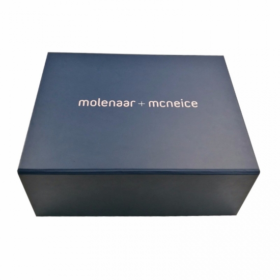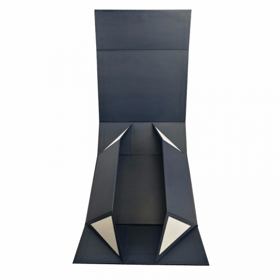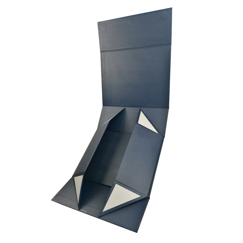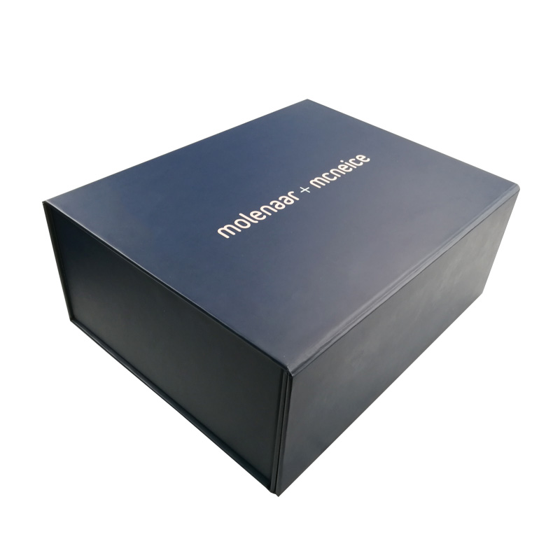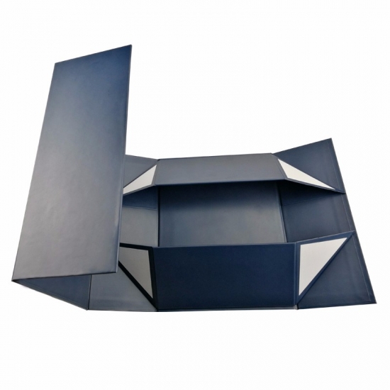 C'est une couleur bleu mat grandes boîtes pliantes plates qui a fait par papier d'art C2S 157g + carton gris 1200g, impression couleur à l'extérieur et à l'intérieur de la boîte avec logo estampé en feuille d'or, il y a des rubans adhésifs doubles aux quatre coins de la boîte de base.