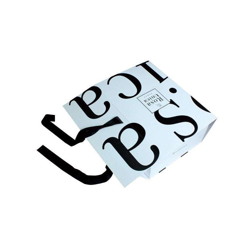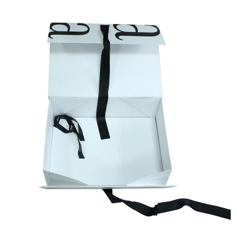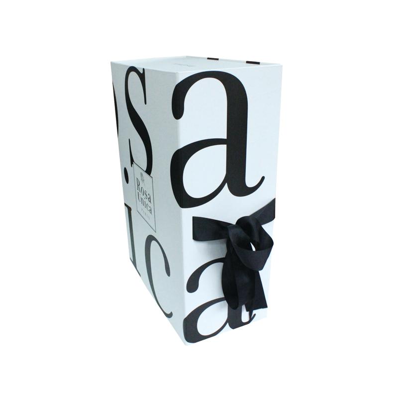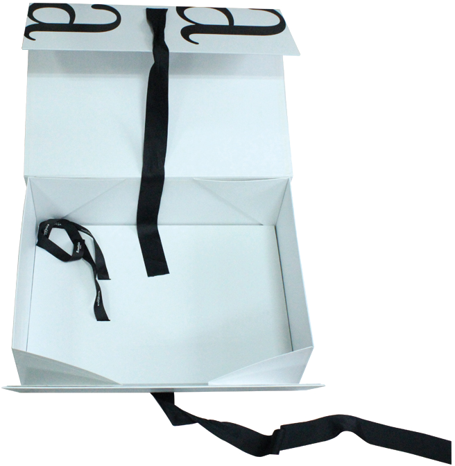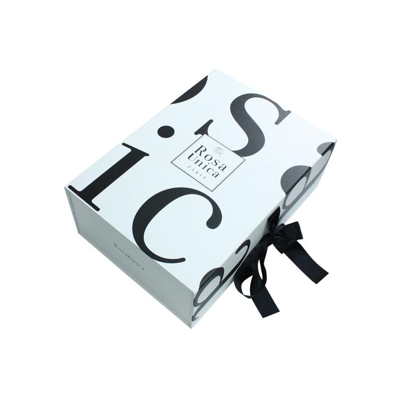 C'est un Coffret cadeau pliable A4 avec ruban Avec un logo noir imprimé sur fond blanc et un ruban. Emballage au design soigné.