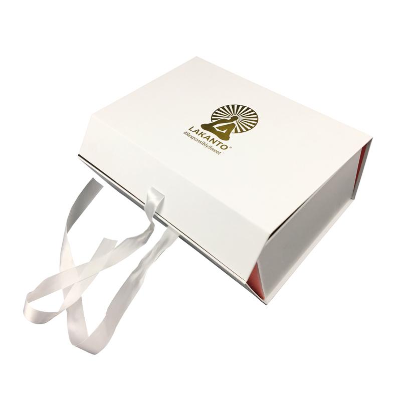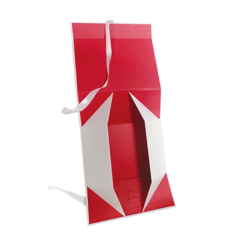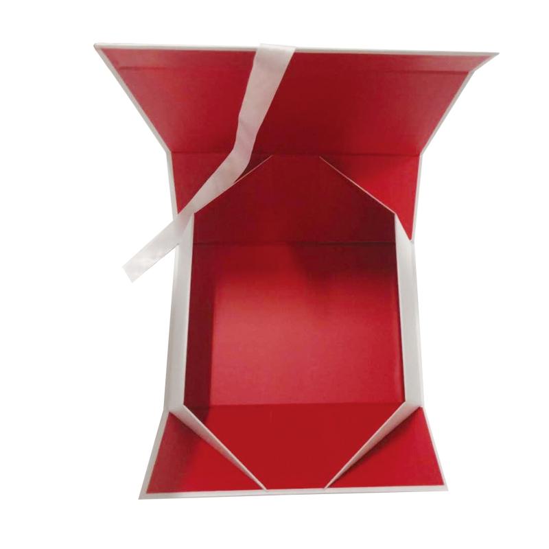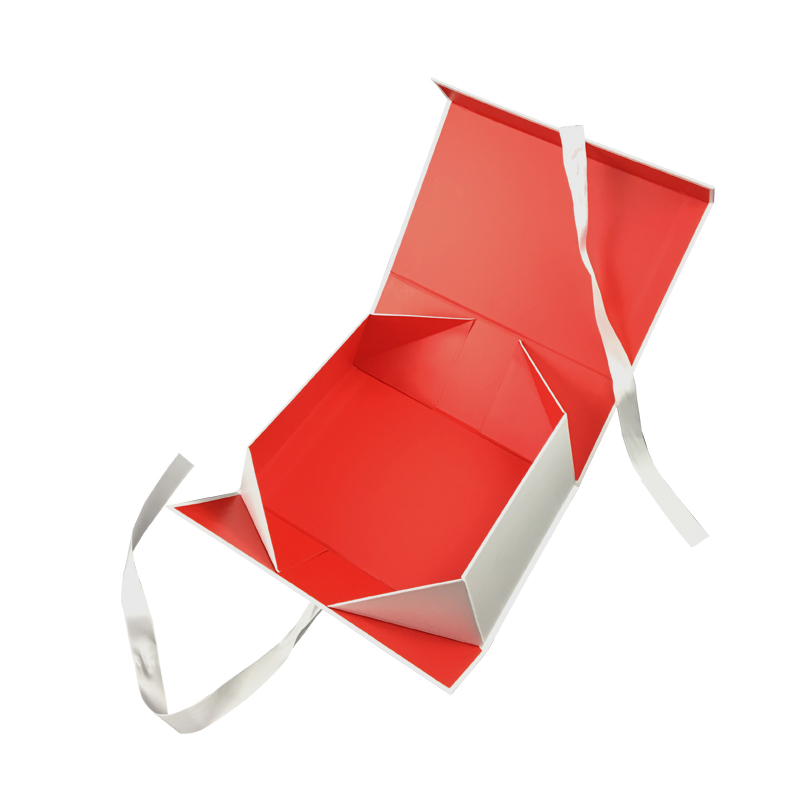 C'est un blanc boîte cadeau pliante avec ruban avec un marquage à chaud à l'extérieur et l'intérieur est rouge pour que votre emballage ne soit plus monotone