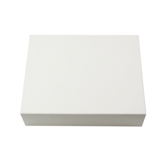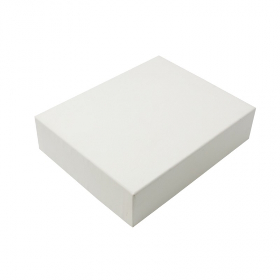 La boîte est fabriquée en papier couché 157 g/m² et carton gris de 2 mm. Ses dimensions sont de 16 x 12 x 3 cm, principalement destinées à l'emballage. D'un blanc immaculé, elle est sans logo personnalisé et affiche un style épuré.