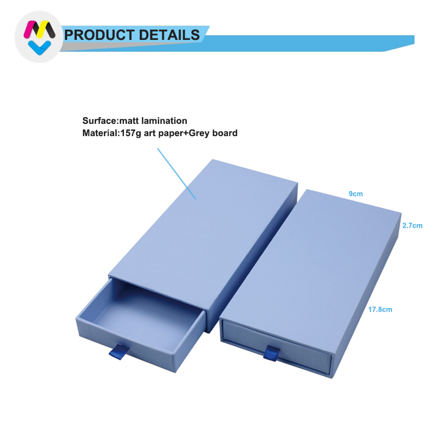 C'est un boîtes à bijoux rectangulaires à tiroirs qui a fait en papier d'art C2S 157g + carton gris 1200g, c'est une boîte en papier standard pour bijoux, bracelets, pendentifs, elle peut personnaliser n'importe quel logo selon votre demande.