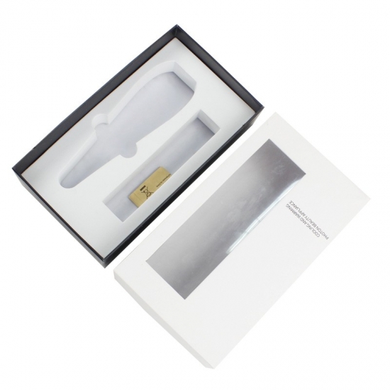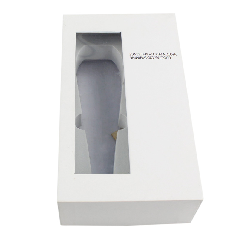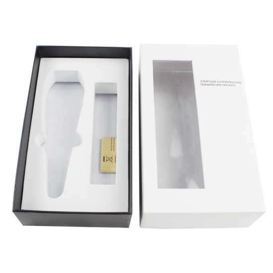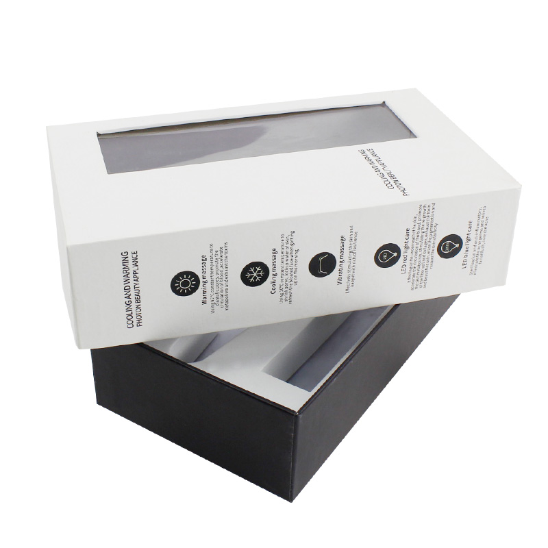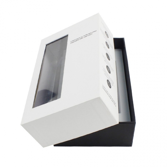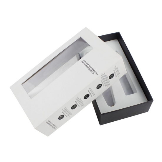 C'est un boîtes cadeaux avec couvercles qui a fait par papier d'art C2S 157g + carton gris 1200g, couvercle blanc avec fenêtre en PVC et base noire avec texte personnalisé sur la boîte, la mousse EVA blanche est personnalisée selon la forme des produits.