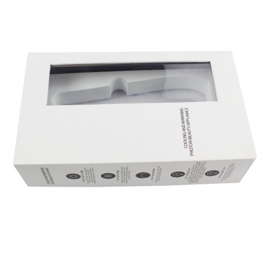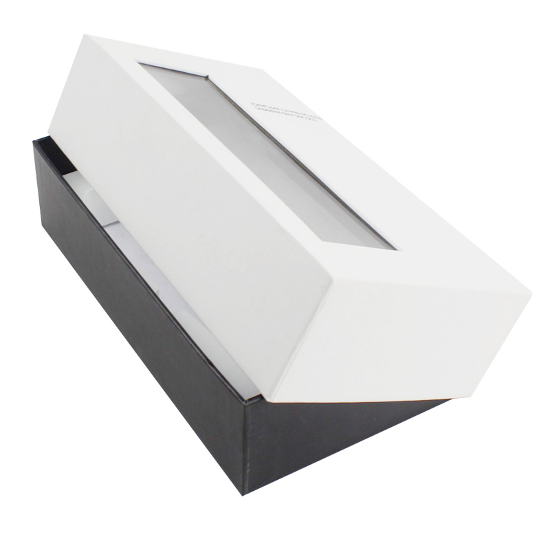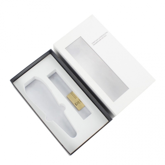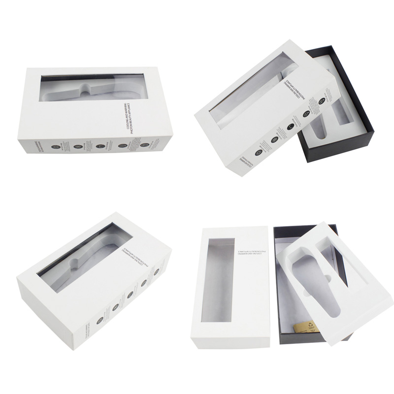 C'est un Couvercle et base boîte qui a fait en papier d'art C2S 157g + carton gris 1200g, couvercle avec fenêtre en PVC transparent pour montrer les produits à l'intérieur, l'intérieur de la boîte a un insert de rembourrage EVA blanc de forme personnalisée.