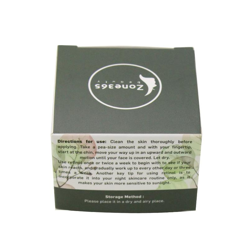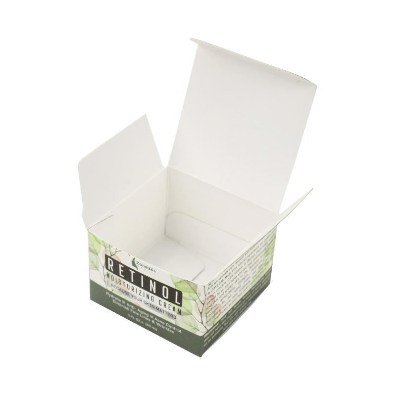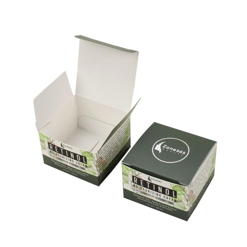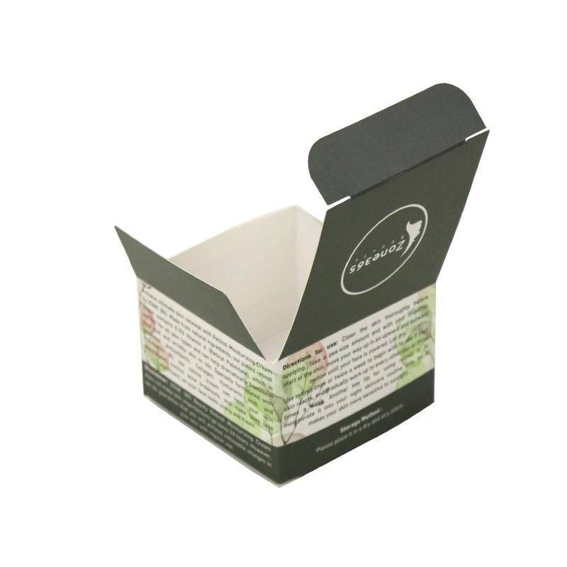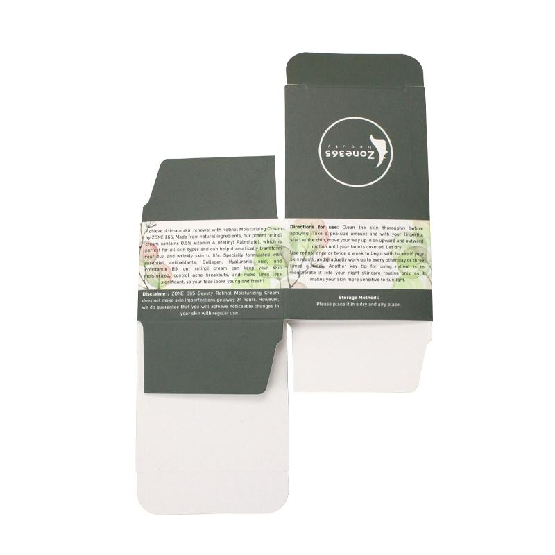 C'est un boîte en carton souple pour cosmétiques qui a fait par papier d'art couché 350 g/m² une face, à l'extérieur de la boîte pleine de texte et d'impression de logo comprenant des instructions et un code-barres, à l'intérieur blanc vierge sans aucune impression.