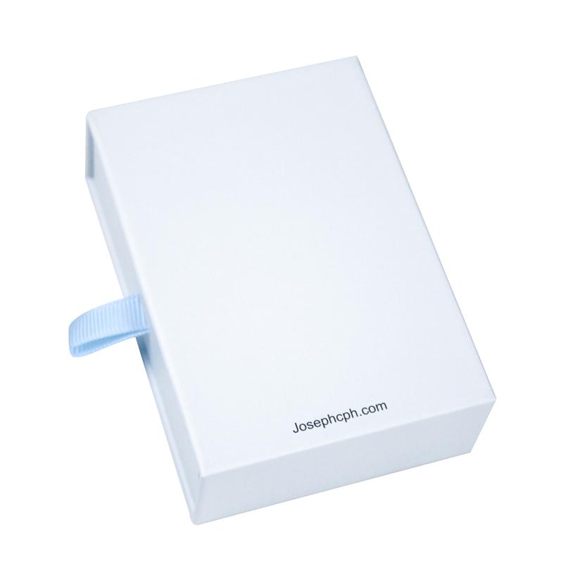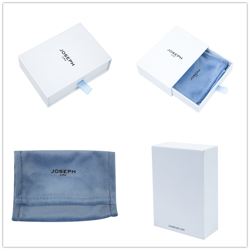 Il s'agit d'une boîte à bijoux en papier de style tiroir fabriquée sur mesure avec une pochette en microfibre, nous pouvons la fabriquer dans différentes textures et couleurs de papier, selon le client. Le logo peut être imprimé / estampé à chaud / gaufré / gaufré sur la boîte à bijoux ou la pochette