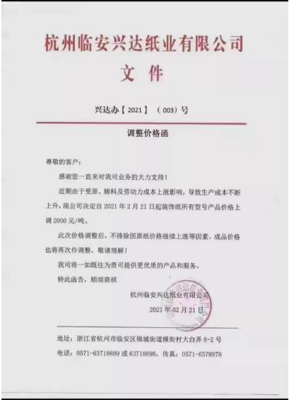 Le 21 février, Hangzhou Lin'an Xingda Paper Co., Ltd. a publié une lettre d'augmentation de prix, indiquant que les coûts de production ont augmenté en raison de la hausse des coûts des matières premières, des matériaux auxiliaires et de la main-d'œuvre. L'entreprise augmentera les prix de tous les types de papiers décoratifs.