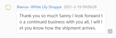 Une semaine après avoir envoyé les échantillons, Bianca Après avoir reçu les échantillons et satisfaite de leur qualité et de leurs couleurs, elle a commandé directement 2 000 lots à titre d'essai. Les marchandises sont maintenant préparées et expédiées. Elle a indiqué qu'elle transférerait toutes les commandes à notre usine à l'avenir, se sentant très soulagée.