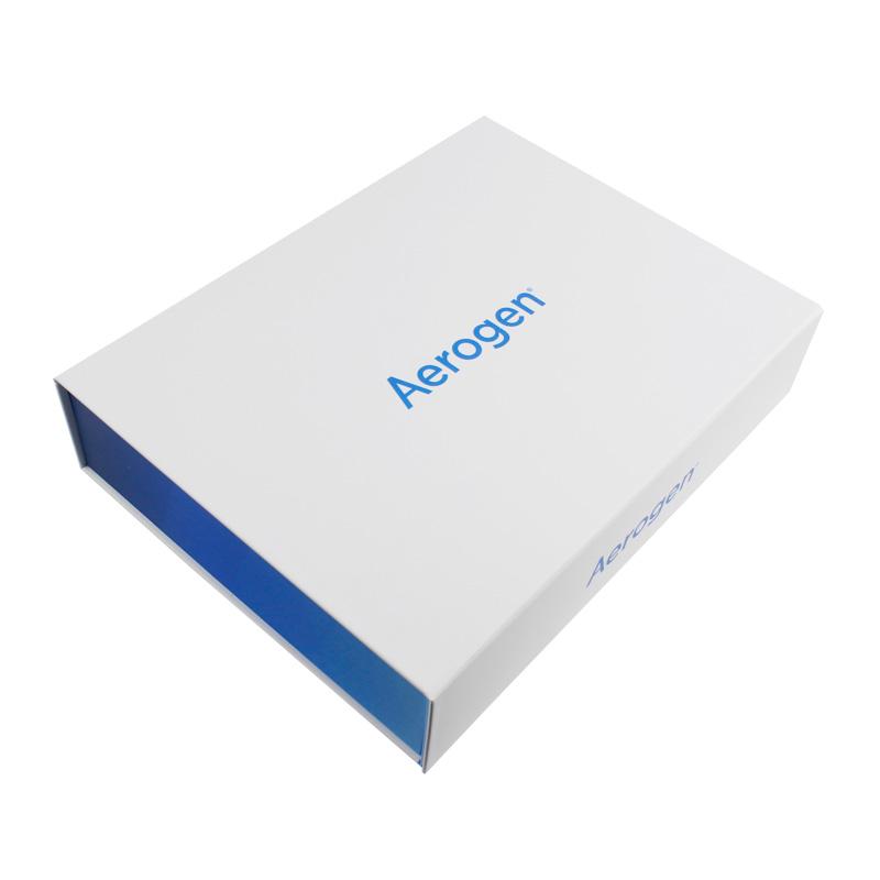 Il s'agit d'une simple boîte blanche avec impression de logo, personnalisée à l'intérieur d'une boîte pliable en carton uni bleu, fabriquée avec du papier d'art C2S 157 g + du carton gris 1200 g, artisanat : finition de surface mate.